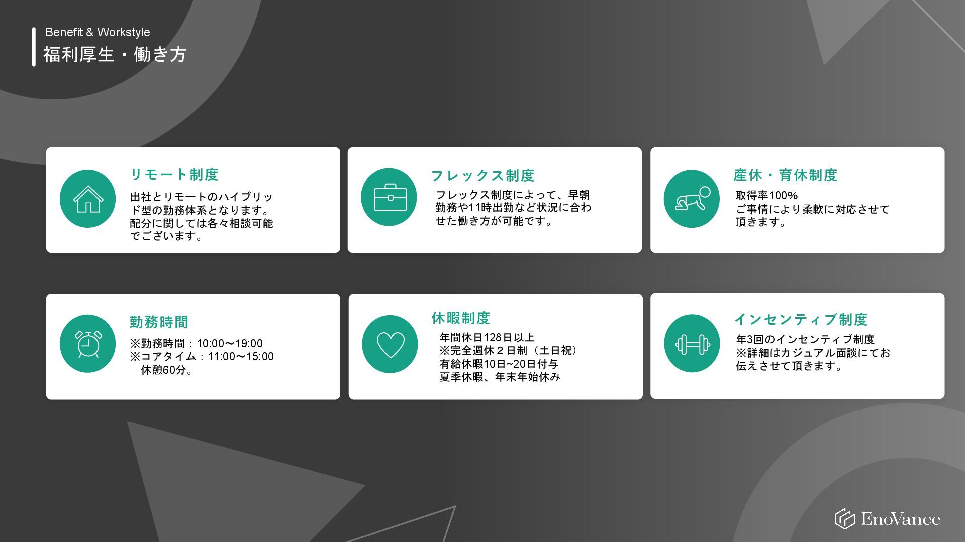 Benefit & Workstyle 福利厚生・働き方 勤務時間 リモート制度 フレックス制度 産休・育休制度 休暇制度 インセンティブ制度