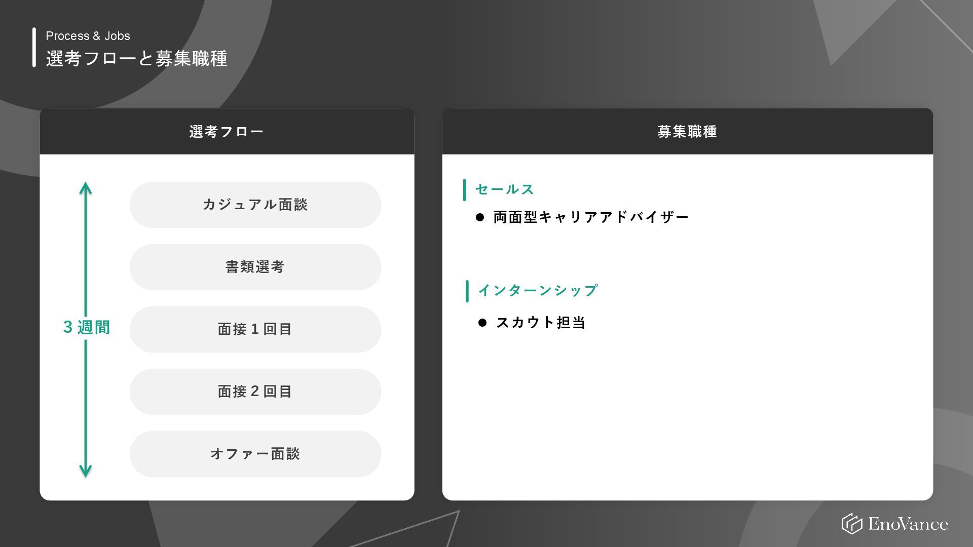 Process & Jobs 選考フローと募集職種 選考フロー カジュアル面談 書類選考 募集職種 面接1回目 面接2回目
