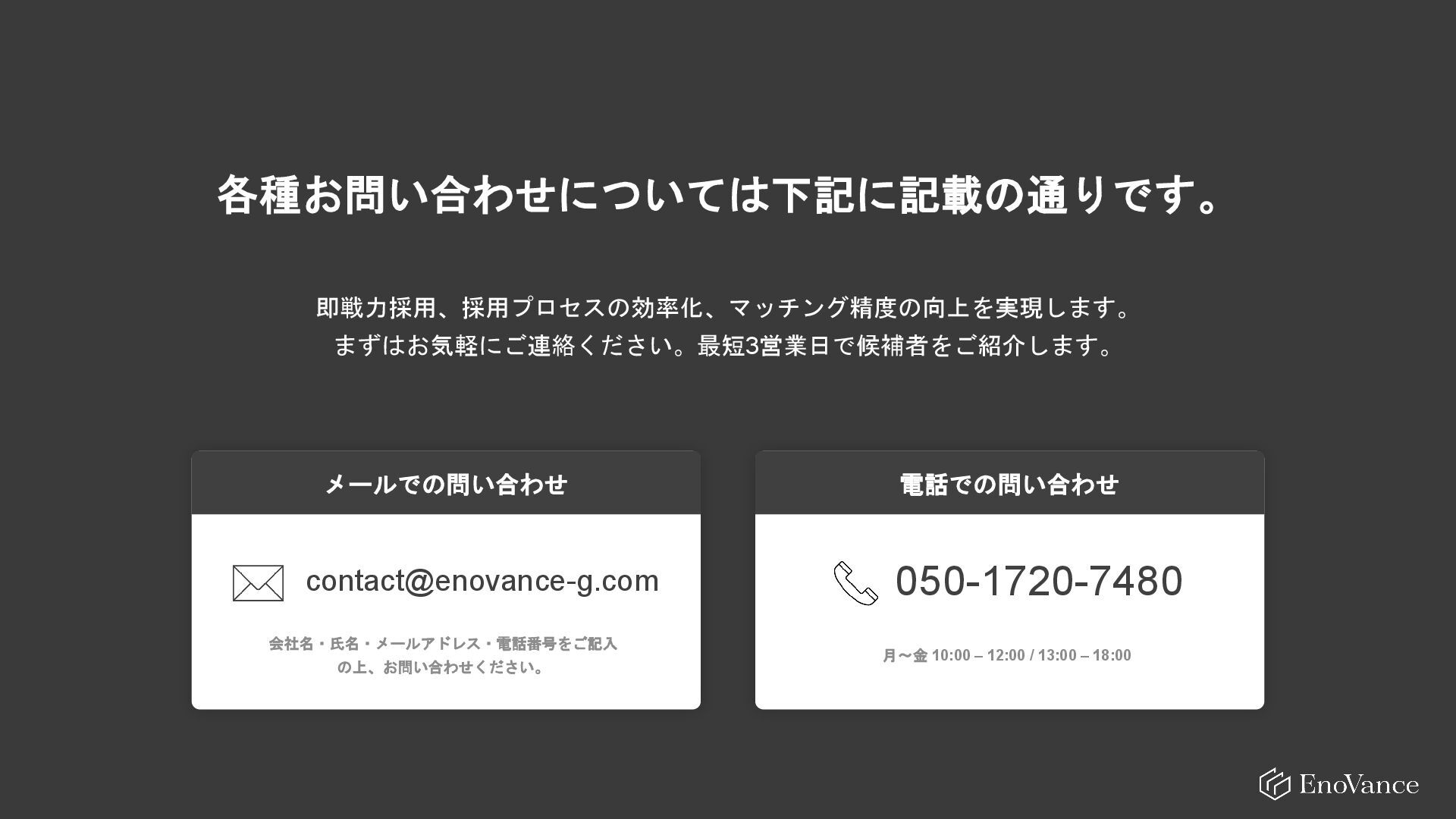 各種お問い合わせについては下記に記載の通りです。 即戦力採用、採用プロセスの効率化、マッチング精度の向上を実現します。 まずはお気軽にご連絡ください。最短3営業日で候補者をご紹介します。 メールでの問い合わせ