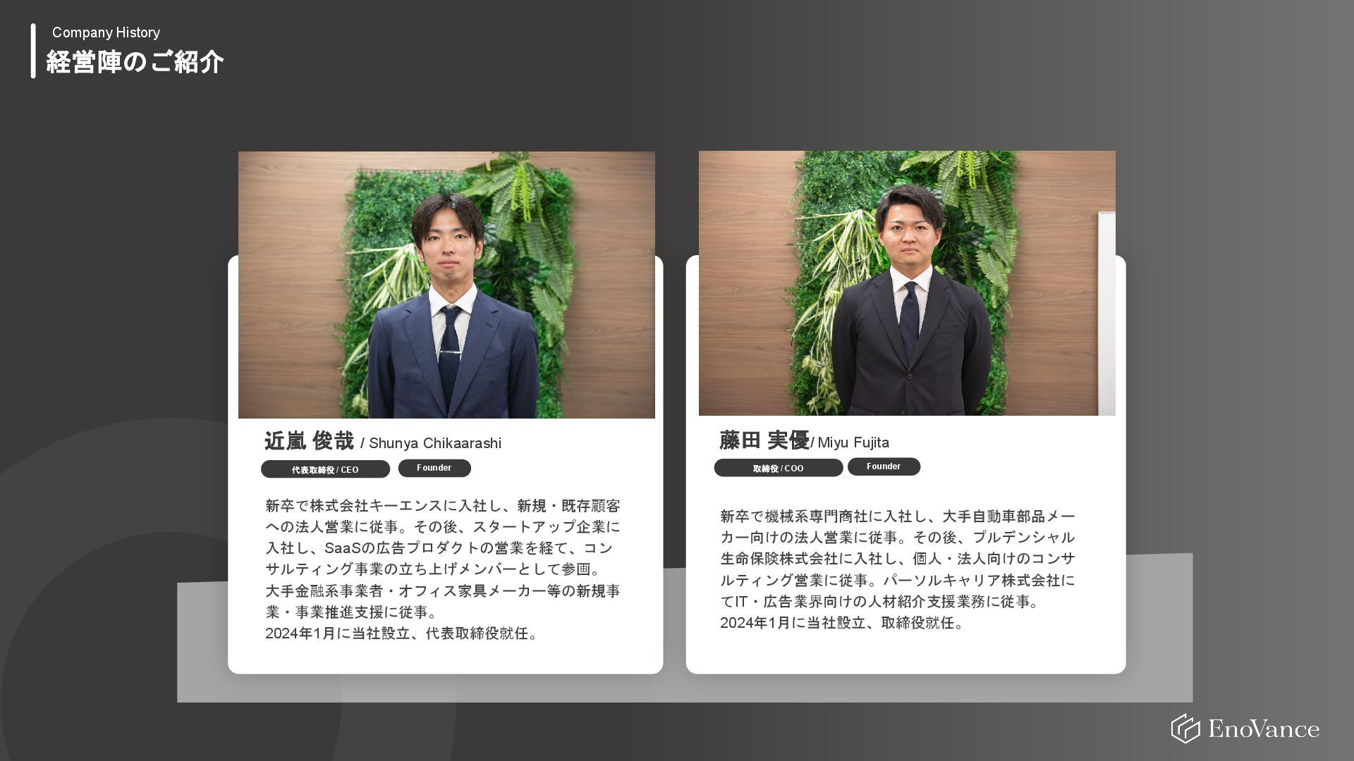 家具メーカー等の新規事業・事業推進支援に従事。 2024年1月に当社設立、代表取締役就任。 代表取締役 / CEO Founder 藤田 実優/ Miyu Fujita 新卒で機械系専門商社に入社し、大手自動車部品メー カー向けの法人営業に従事。その後、プルデンシャル 生命保険株式会社に入社し、個人・法人向けのコンサ ルティング営業に従事。パーソルキャリア株式会社に てIT・広告業界向けの人材紹介支援業務に従事。 2024年1月に当社設立、取締役就任。 代表取締役 / CEO Founder 新卒で株式会社キーエンスに入社し、新規・既存顧客 への法人営業に従事。その後、スタートアップ企業に 入社し、SaaSの広告プロダクトの営業を経て、コン サルティング事業の立ち上げメンバーとして参画。 大手金融系事業者・オフィス家具メーカー等の新規事 業・事業推進支援に従事。 2024年1月に当社設立、代表取締役就任。 取締役 / COO Founder 近嵐 俊哉 / Shunya Chikaarashi 経営陣のご紹介 Company History