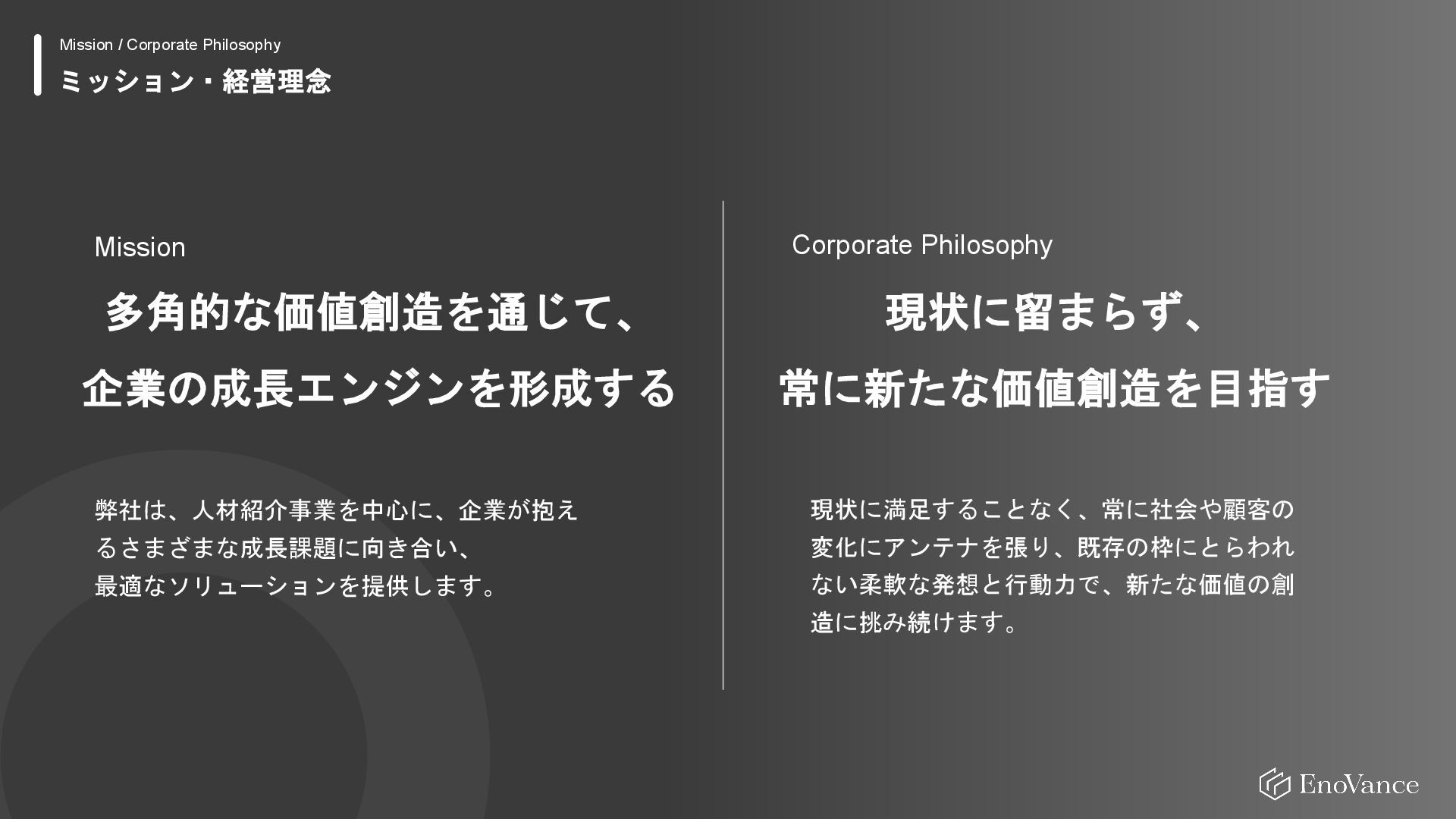 ミッション・経営理念 多角的な価値創造を通じて、 企業の成長エンジンを形成する Mission 弊社は、人材紹介事業を中心に、企業が抱え るさまざまな成長課題に向き合い、 最適なソリューションを提供します。 現状に留まらず、 常に新たな価値創造を目指す Corporate
