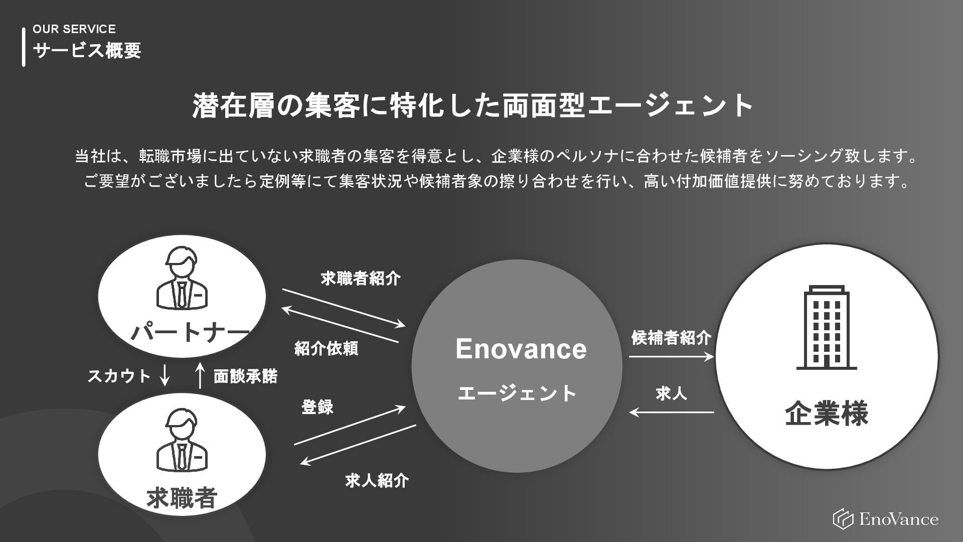 本資料は、株式会社EnoVanceの事業内容、提供サービス、強み、これまでの実績などをまとめた会社紹介スライドです。新規のお取引先様や採用候補者様へのご説明を目的としています。