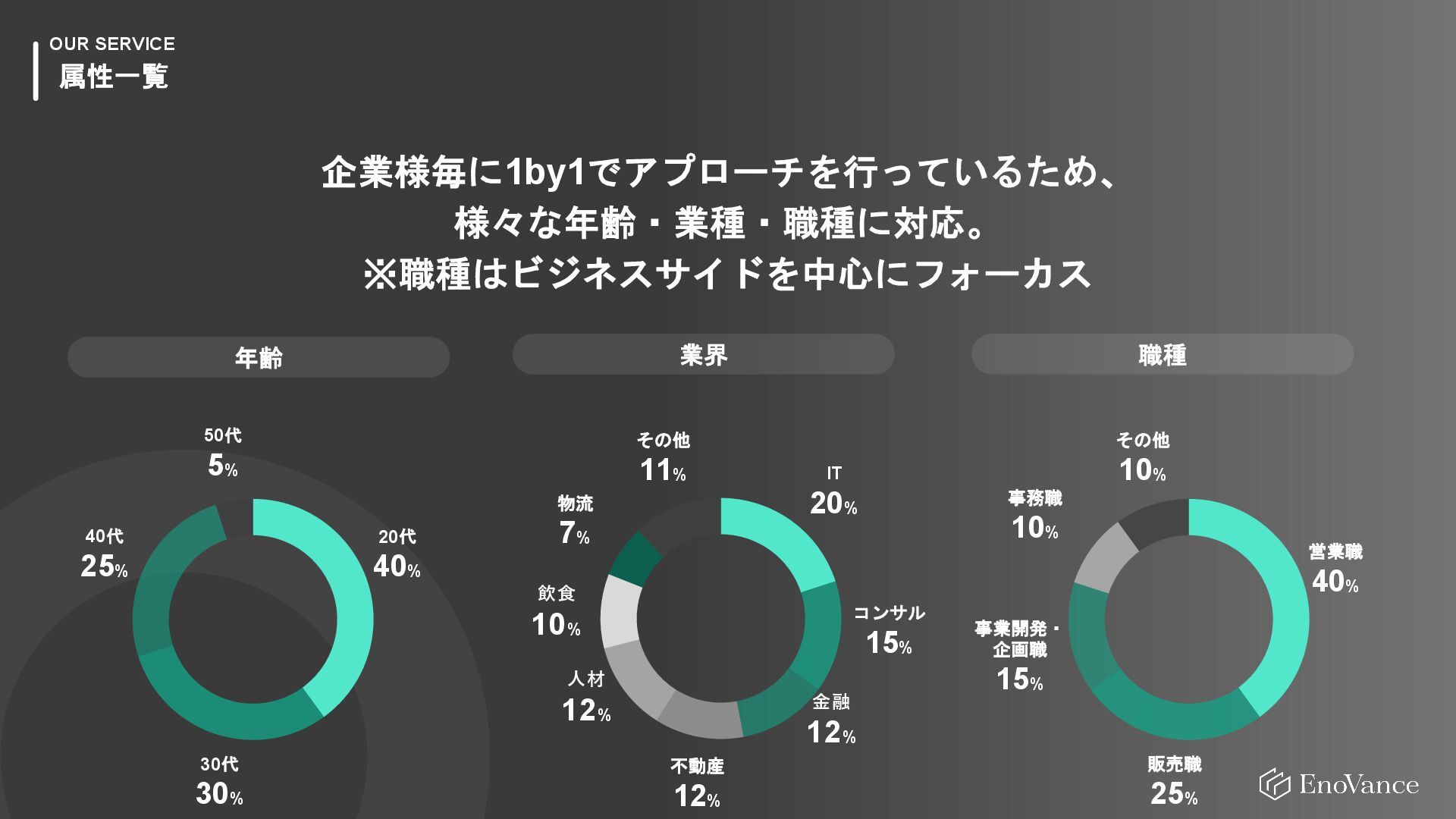 企業様毎に1by1でアプローチを行っているため、 様々な年齢・業種・職種に対応。 ※職種はビジネスサイドを中心にフォーカス 年齢 20代 40% 30代 30% 40代 25%