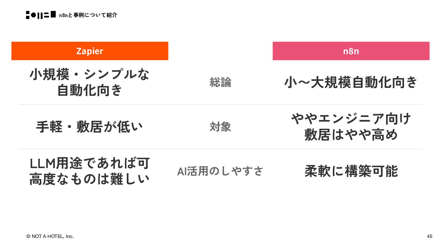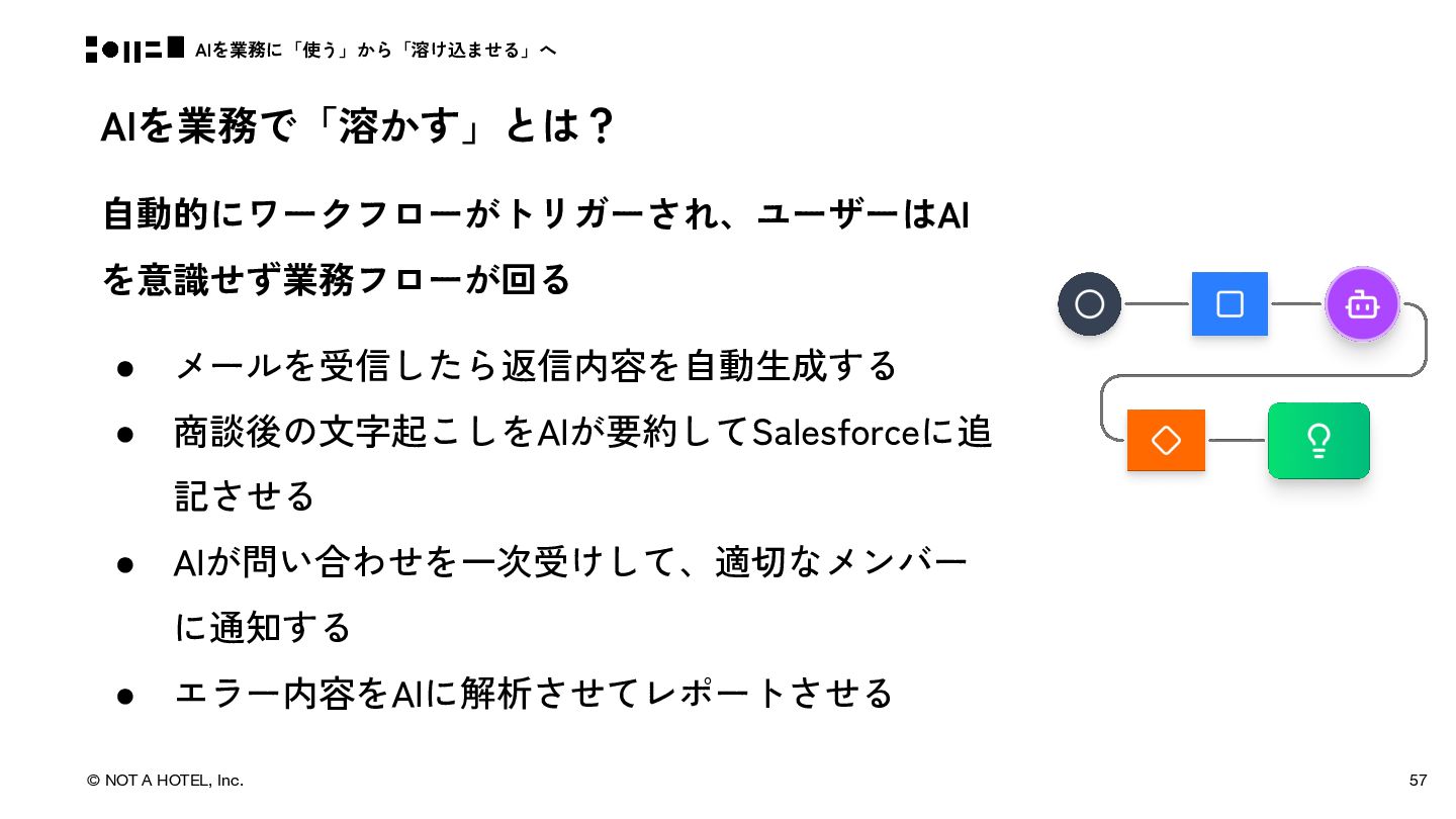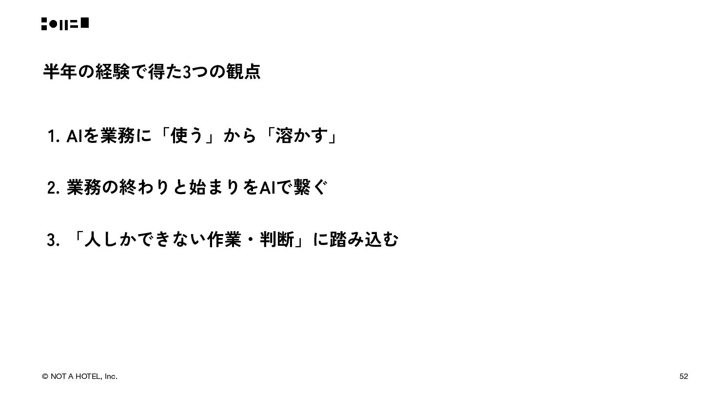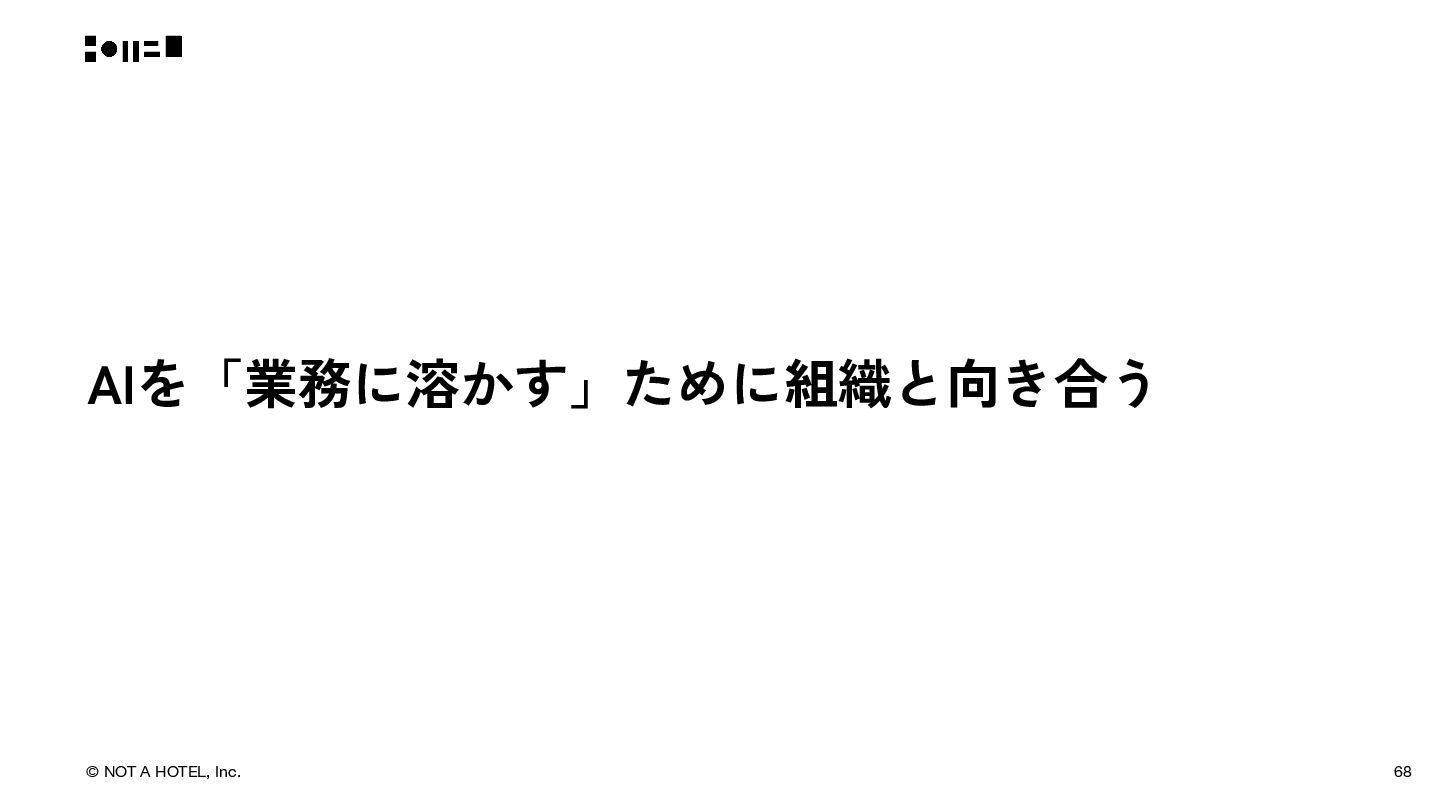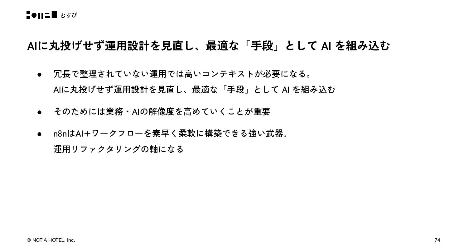 技術面では、ZapierによるワークフローとGeminiを組み合わせた導入しやすいソリューションを構築。現在はn8nを用いて、よりAIを中心とした自動化に取り組んでいます。本スライドでは、これらの具体例を通じて、「組織内で何をAI化すべきか」という課題への実践的アプローチをお伝えしました。