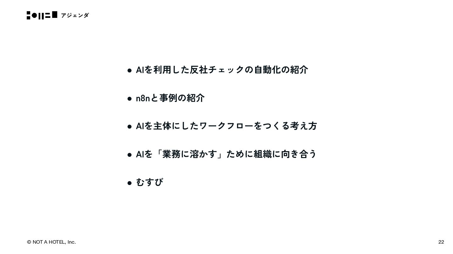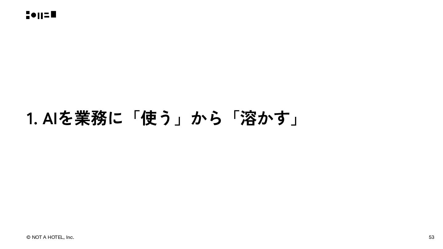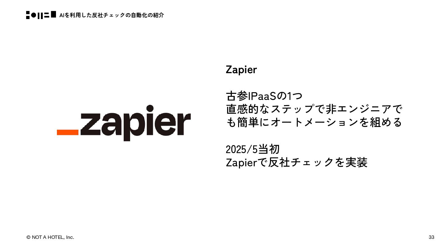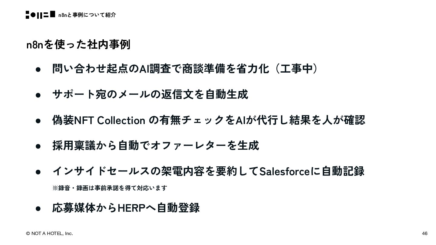 技術面では、ZapierによるワークフローとGeminiを組み合わせた導入しやすいソリューションを構築。現在はn8nを用いて、よりAIを中心とした自動化に取り組んでいます。本スライドでは、これらの具体例を通じて、「組織内で何をAI化すべきか」という課題への実践的アプローチをお伝えしました。