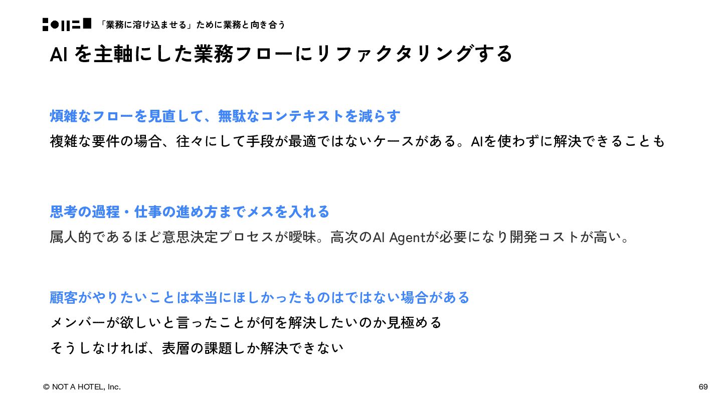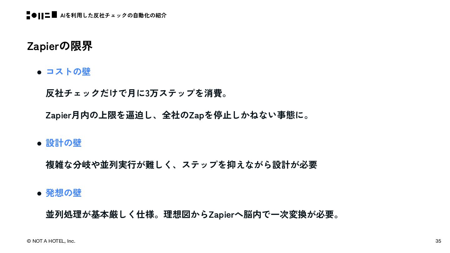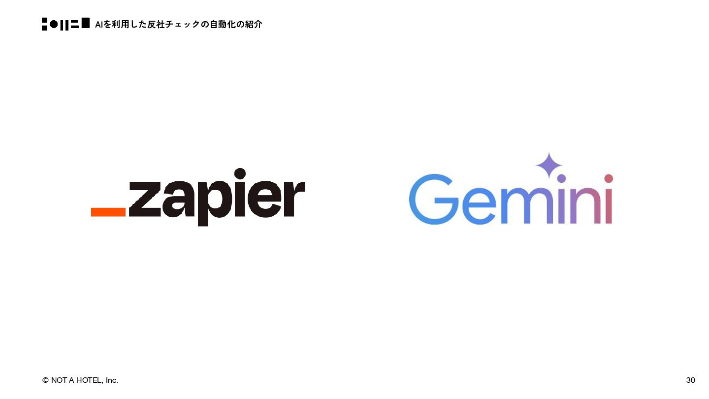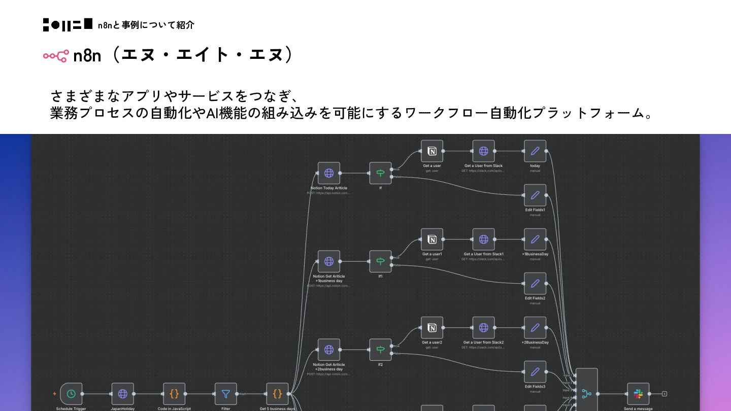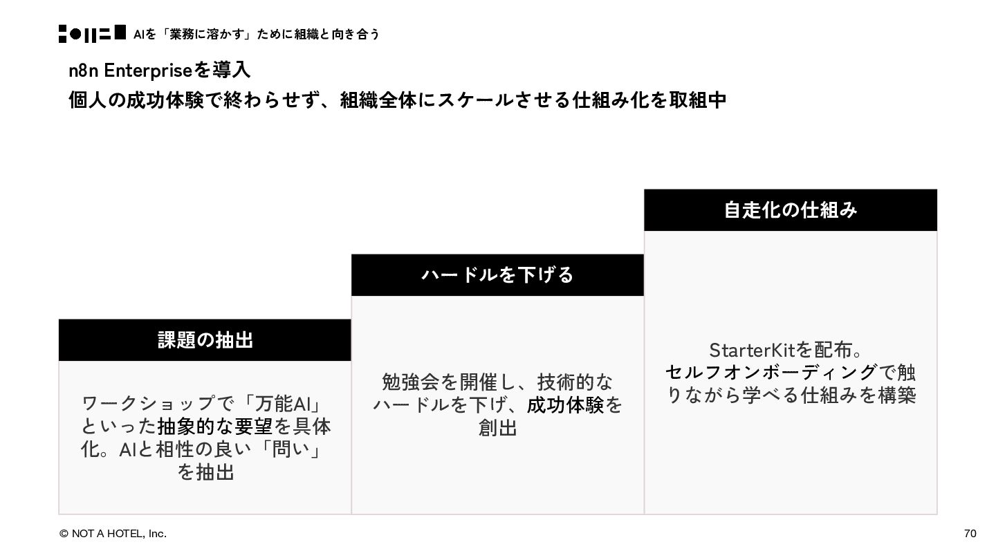 技術面では、ZapierによるワークフローとGeminiを組み合わせた導入しやすいソリューションを構築。現在はn8nを用いて、よりAIを中心とした自動化に取り組んでいます。本スライドでは、これらの具体例を通じて、「組織内で何をAI化すべきか」という課題への実践的アプローチをお伝えしました。