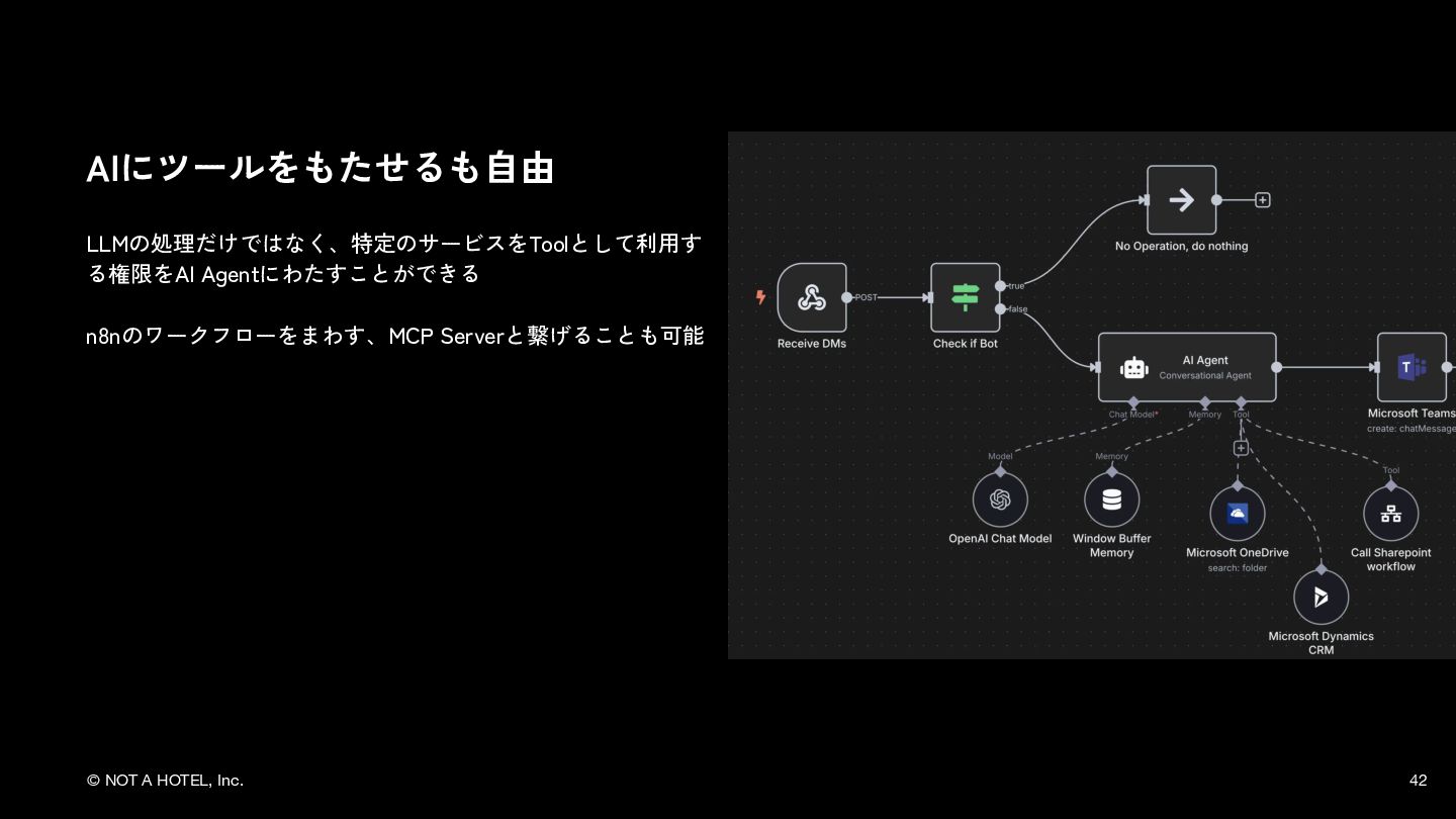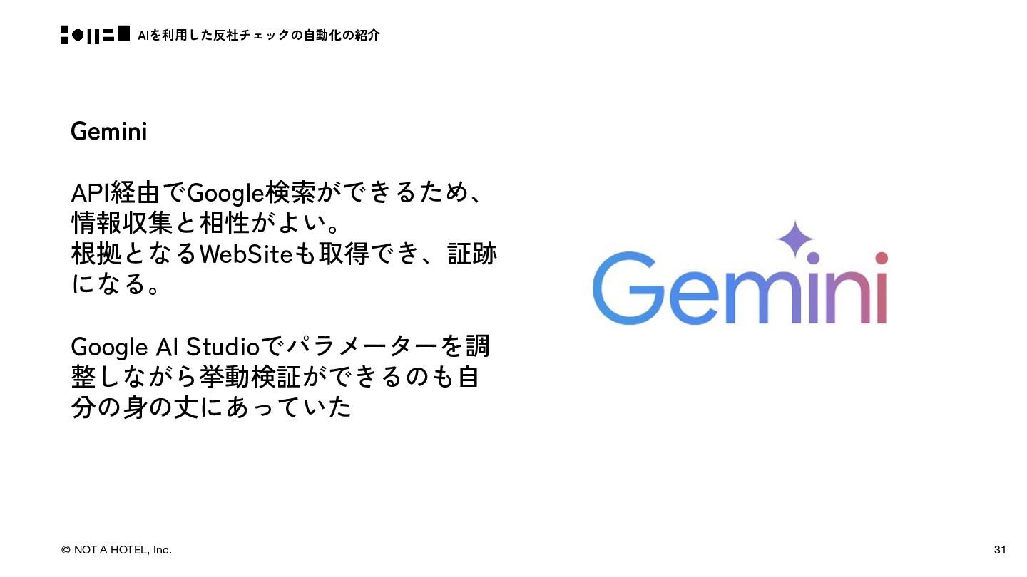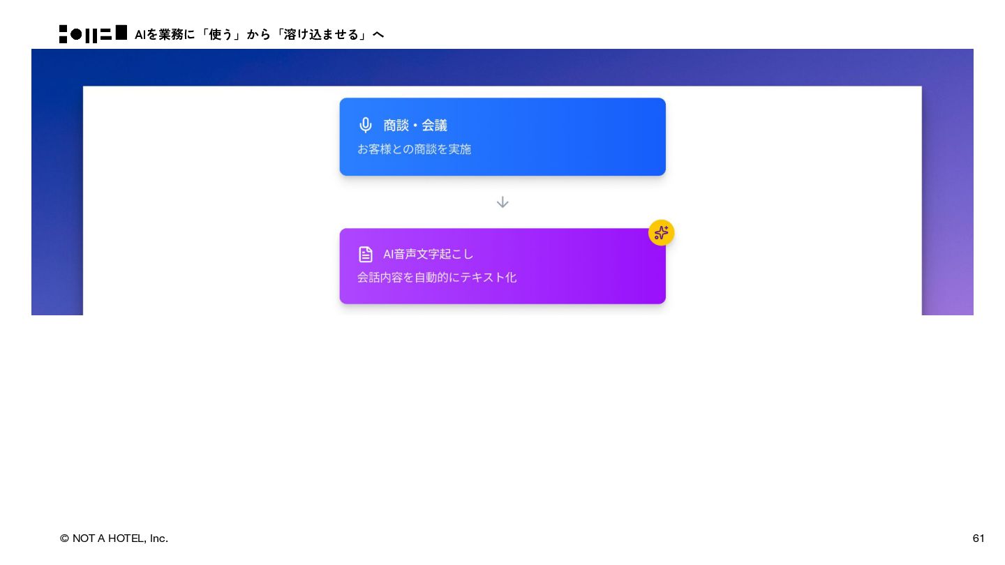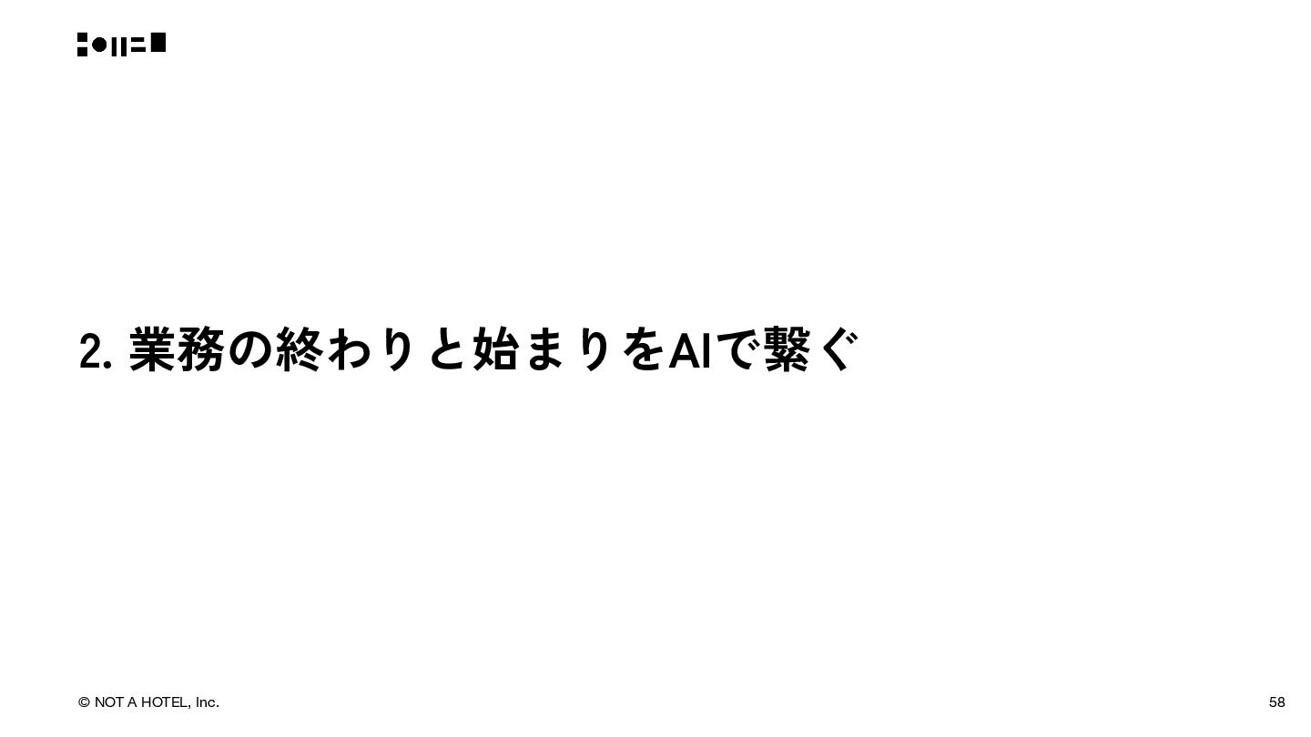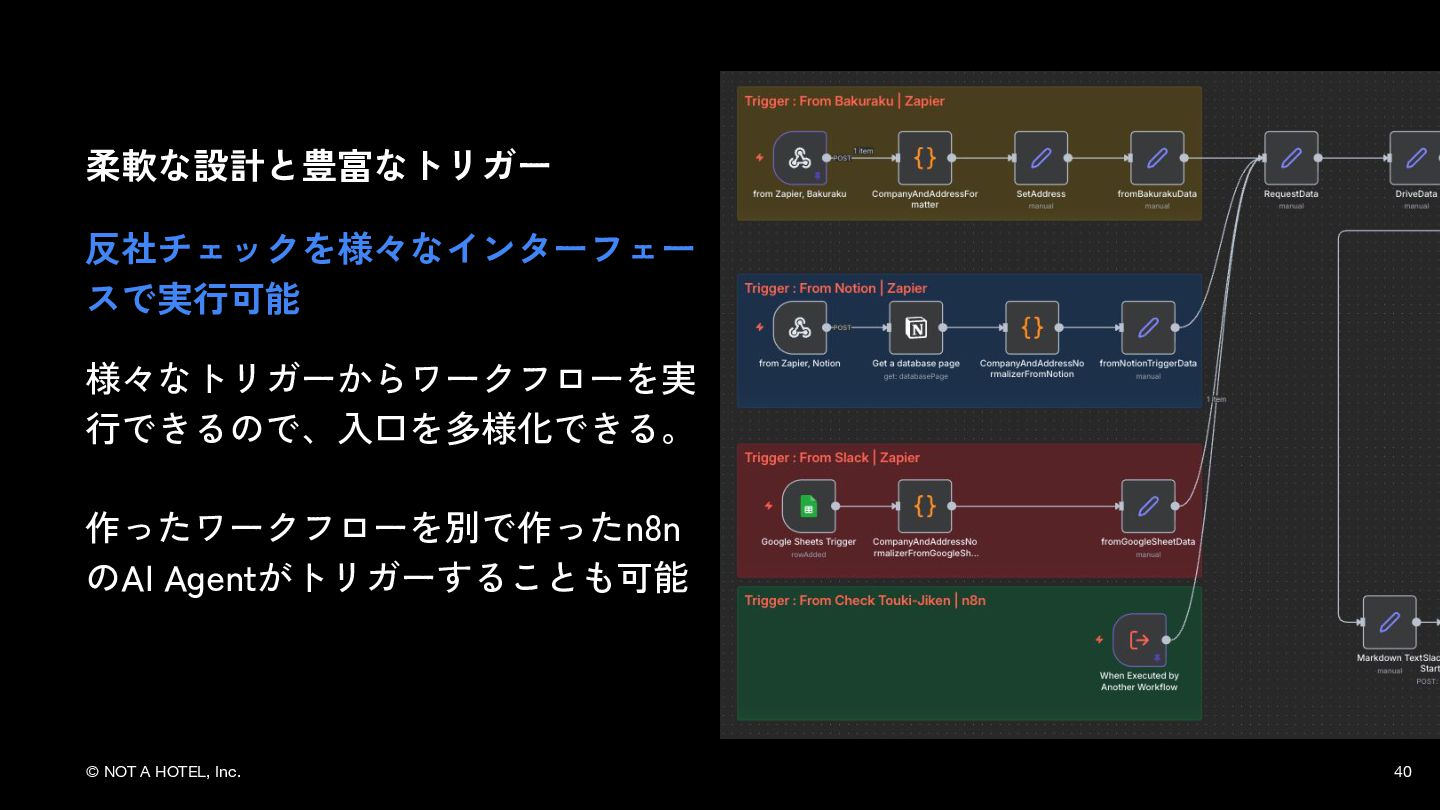 技術面では、ZapierによるワークフローとGeminiを組み合わせた導入しやすいソリューションを構築。現在はn8nを用いて、よりAIを中心とした自動化に取り組んでいます。本スライドでは、これらの具体例を通じて、「組織内で何をAI化すべきか」という課題への実践的アプローチをお伝えしました。