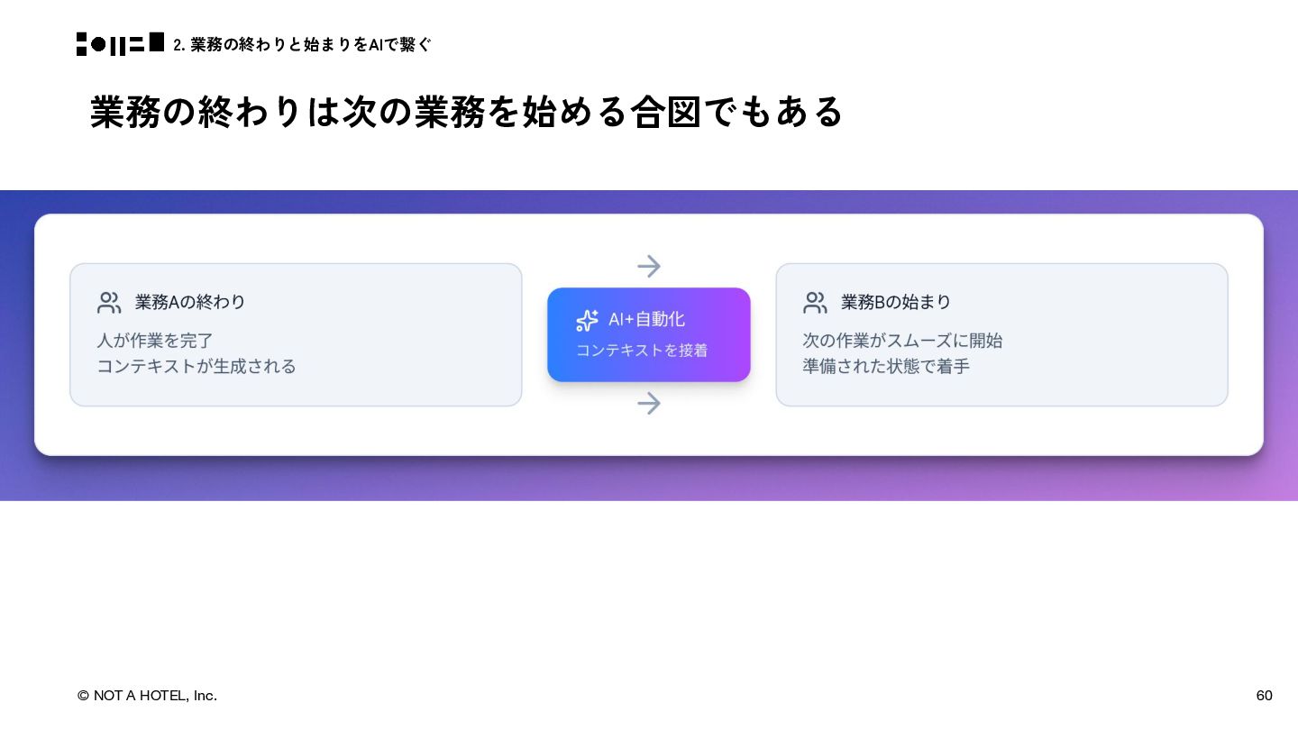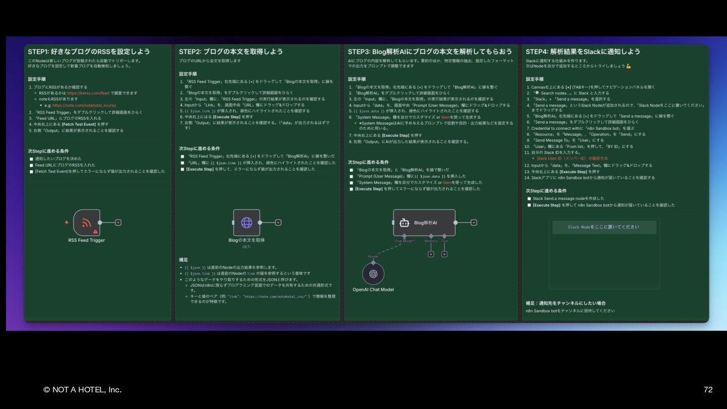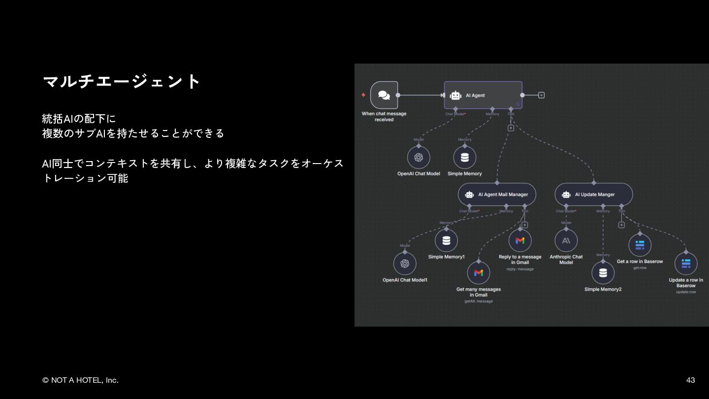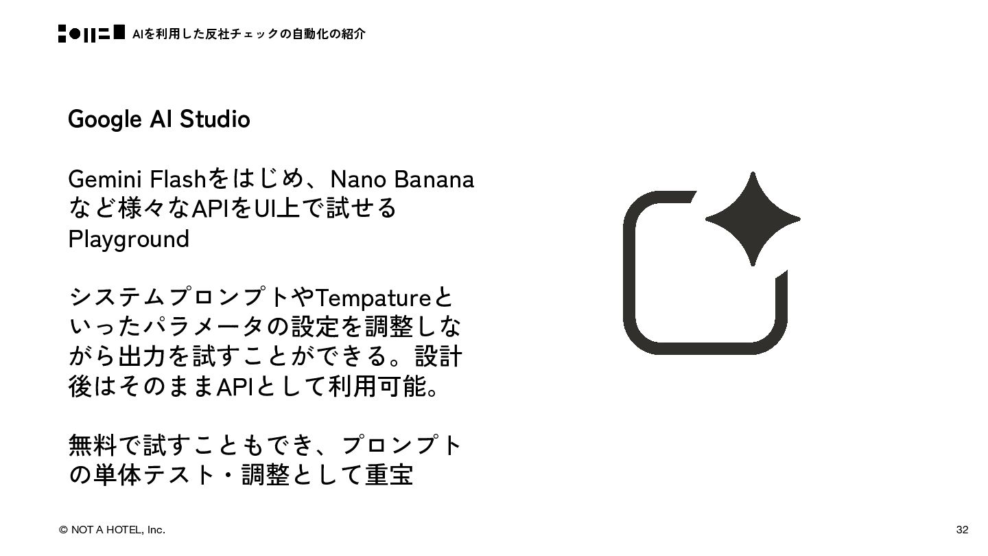 技術面では、ZapierによるワークフローとGeminiを組み合わせた導入しやすいソリューションを構築。現在はn8nを用いて、よりAIを中心とした自動化に取り組んでいます。本スライドでは、これらの具体例を通じて、「組織内で何をAI化すべきか」という課題への実践的アプローチをお伝えしました。