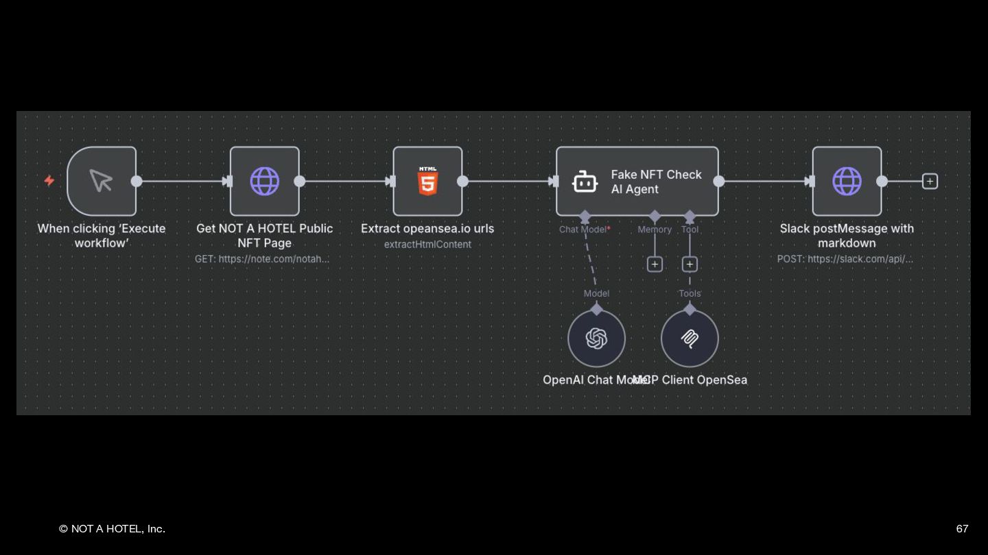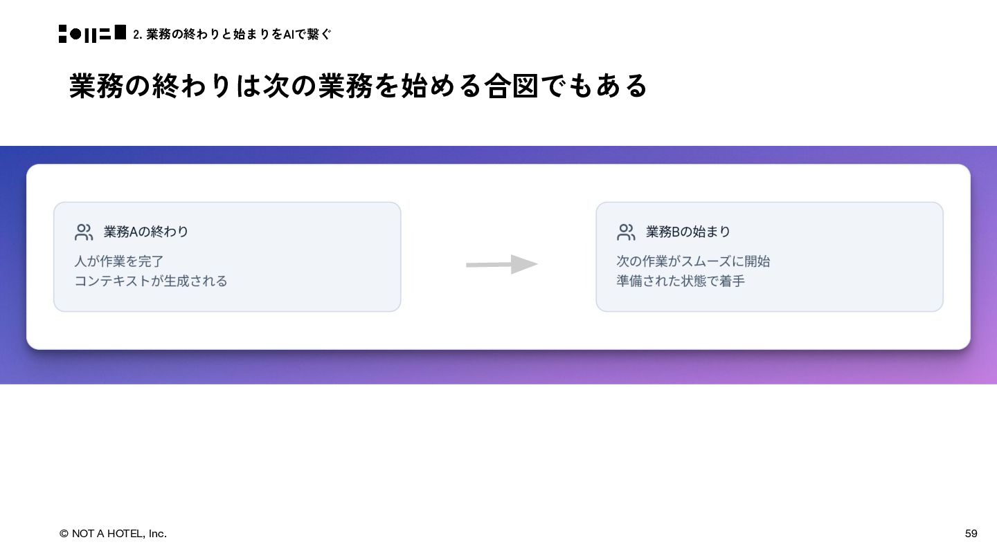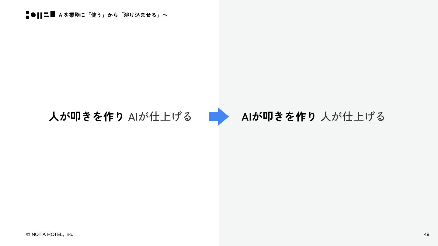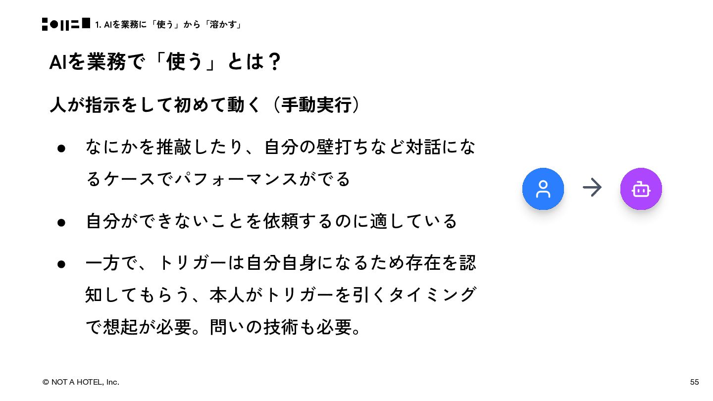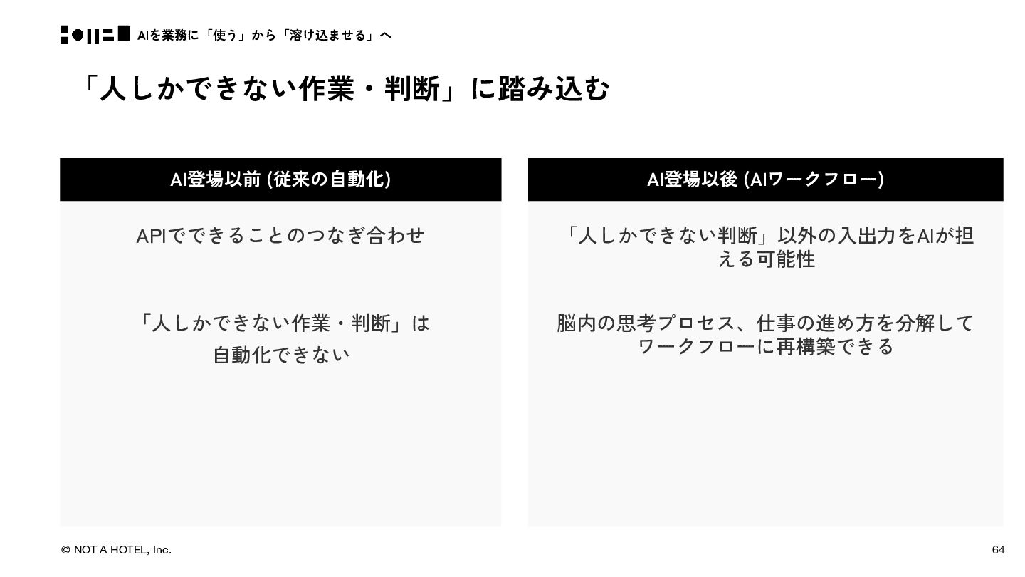 技術面では、ZapierによるワークフローとGeminiを組み合わせた導入しやすいソリューションを構築。現在はn8nを用いて、よりAIを中心とした自動化に取り組んでいます。本スライドでは、これらの具体例を通じて、「組織内で何をAI化すべきか」という課題への実践的アプローチをお伝えしました。