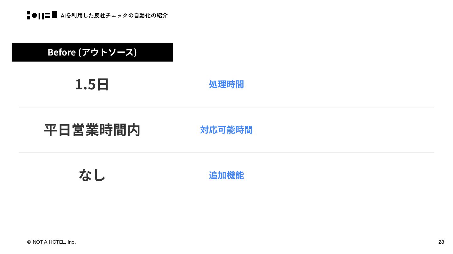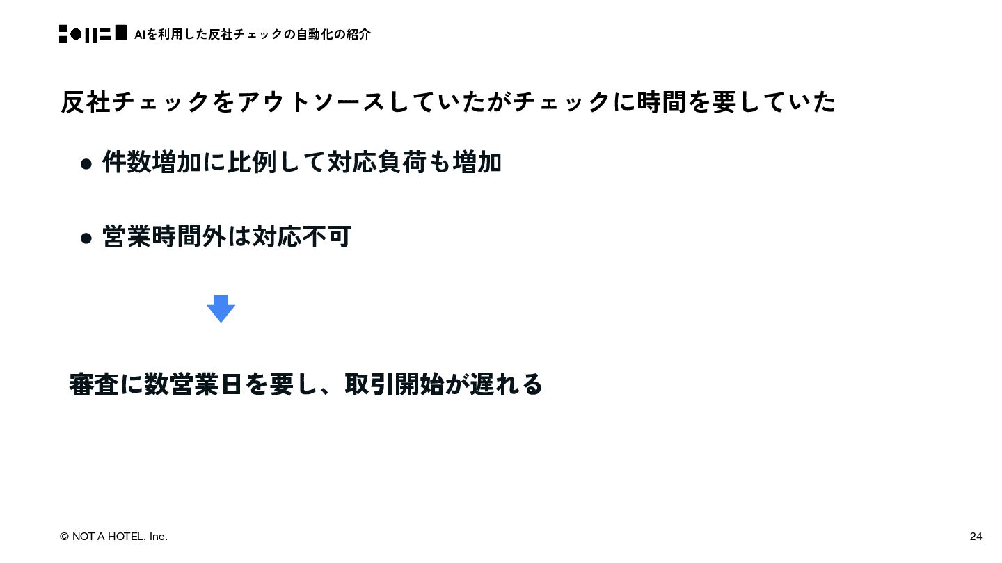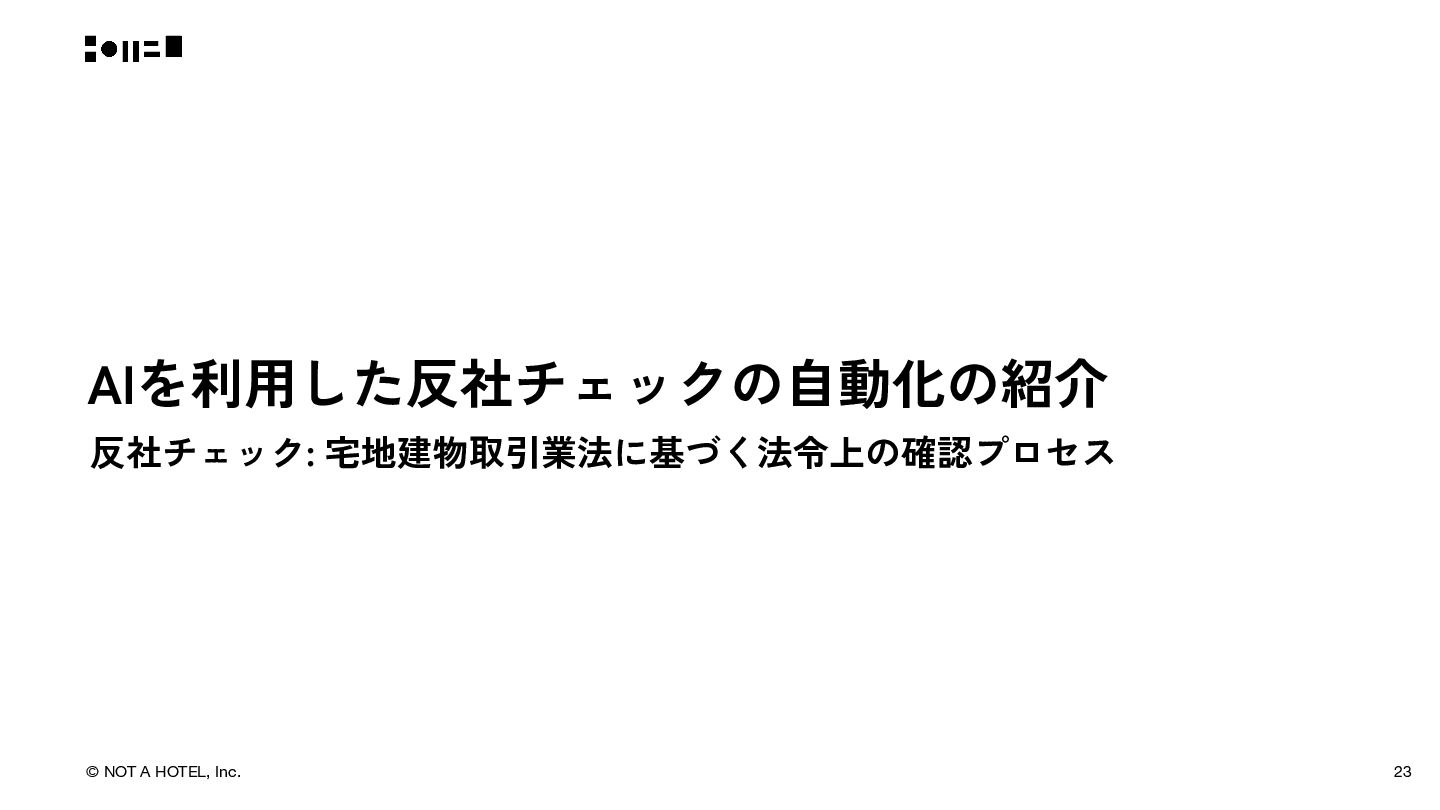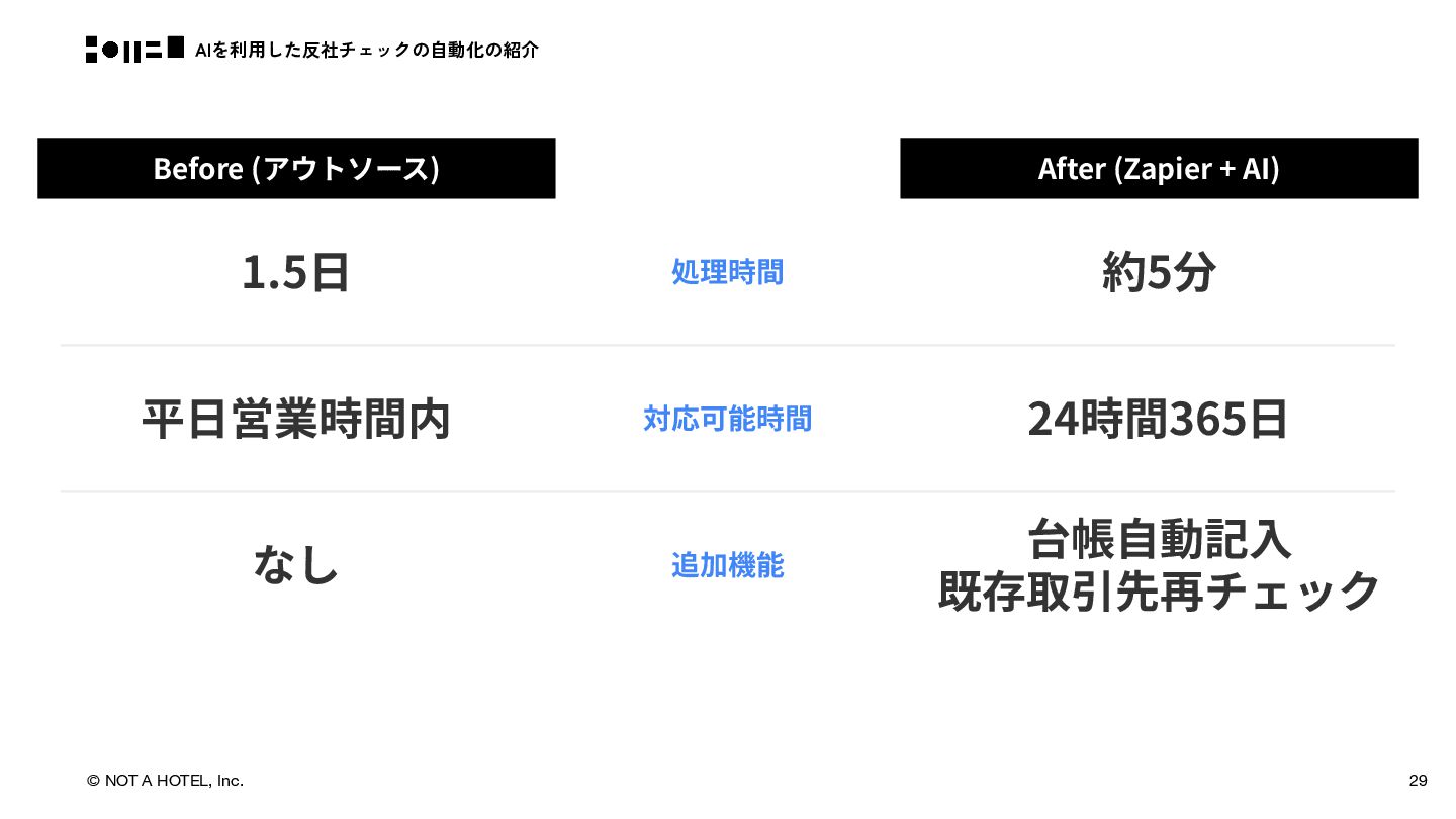 AIを活用して反社チェック業務の一部を自動化し、1件あたり約34時間、月間で約150日分の工数を削減しました。この成功事例をもとに、資料請求フォームの請求者調査プロセスのAI化も進めています。