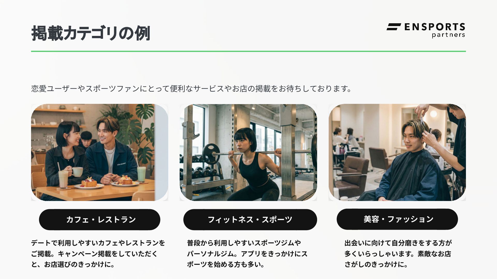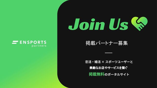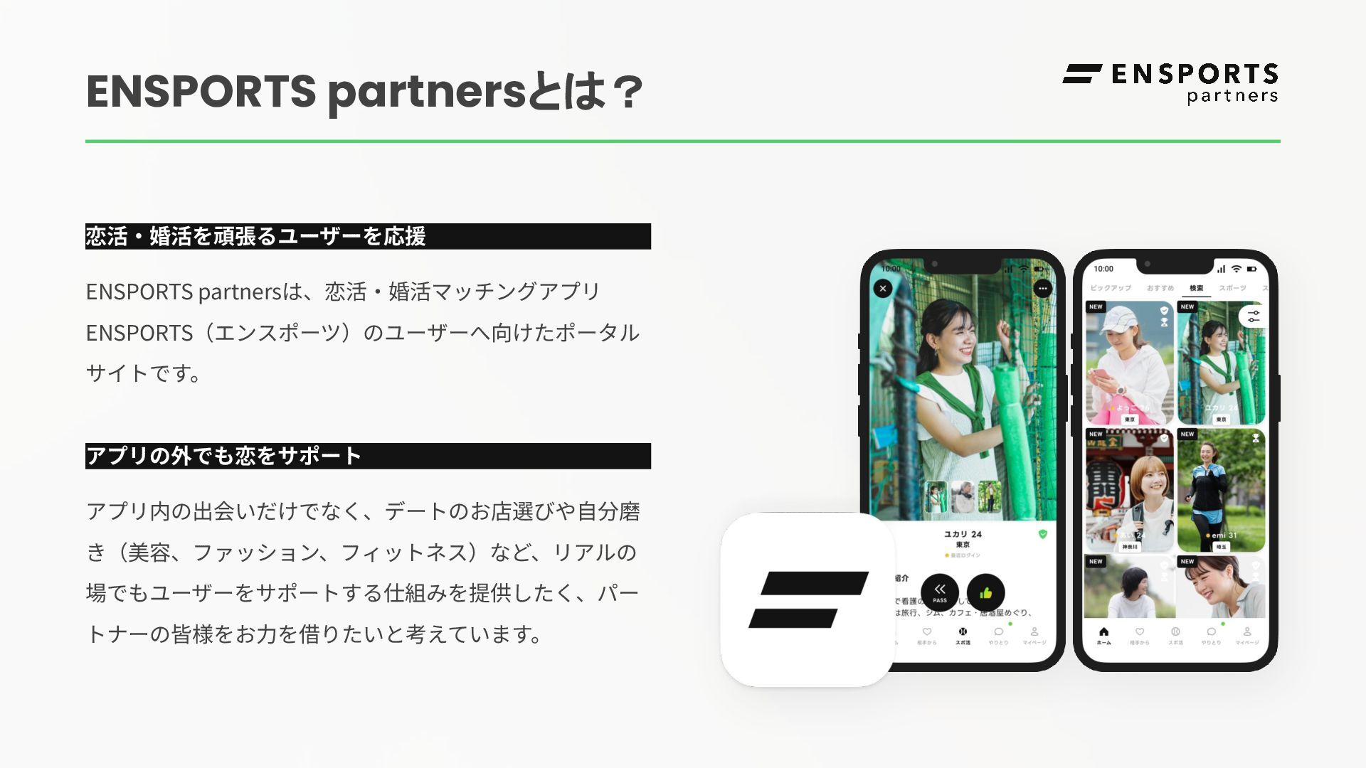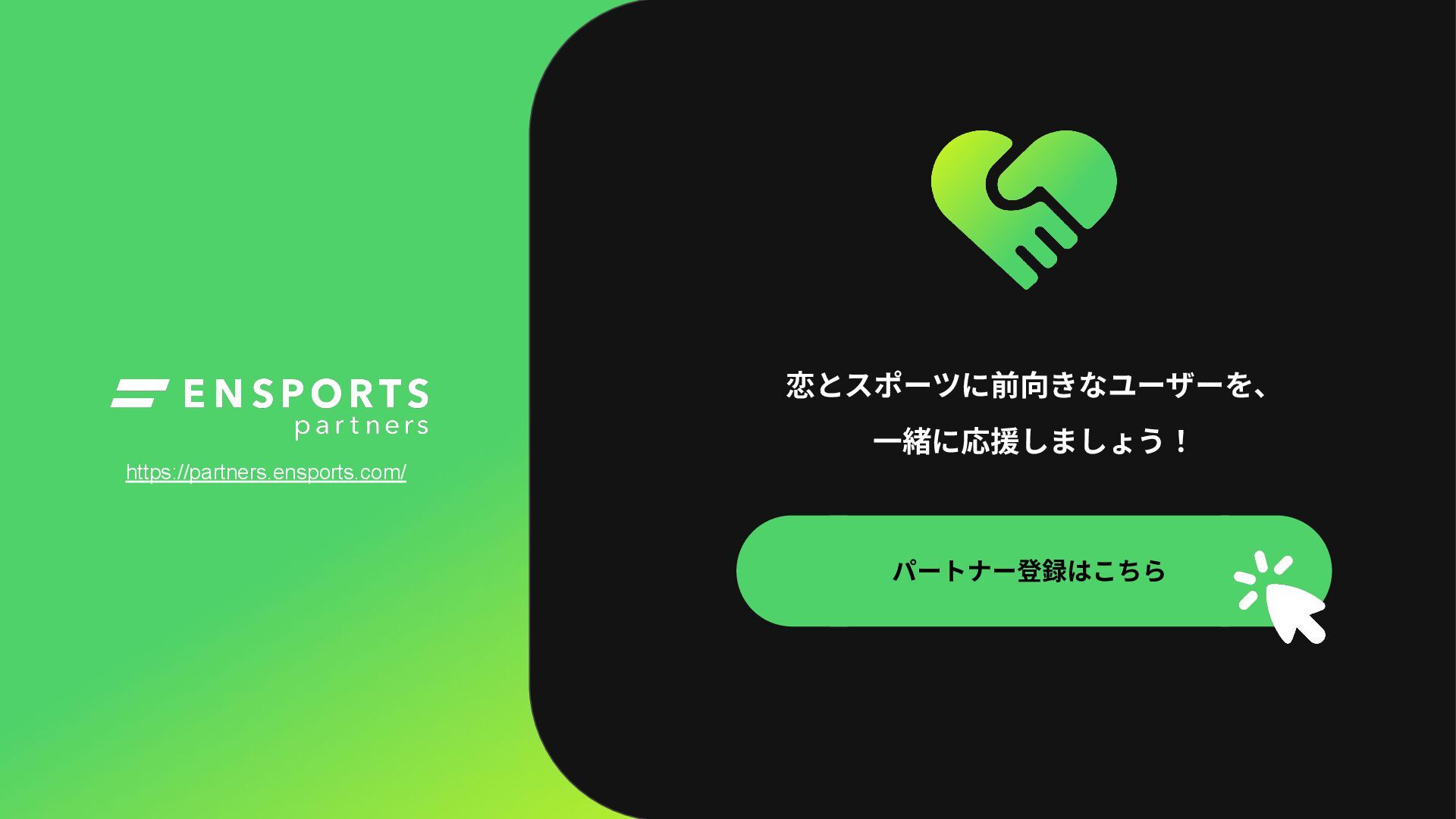 恋とスポーツに前向きなユーザーを、 ⼀緒に応援しましょう! パートナー登録はこちら https://partners.ensports.com/