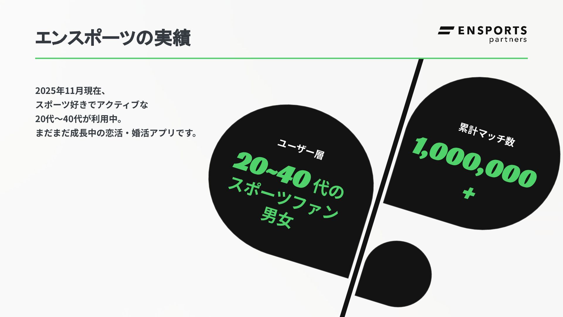 エンスポーツの実績 2025年11⽉現在、 スポーツ好きでアクティブな 20代〜40代が利⽤中。 まだまだ成⻑中の恋活‧婚活アプリです。 20~40代の スポーツファン 男⼥ ユーザー層 1,000,000