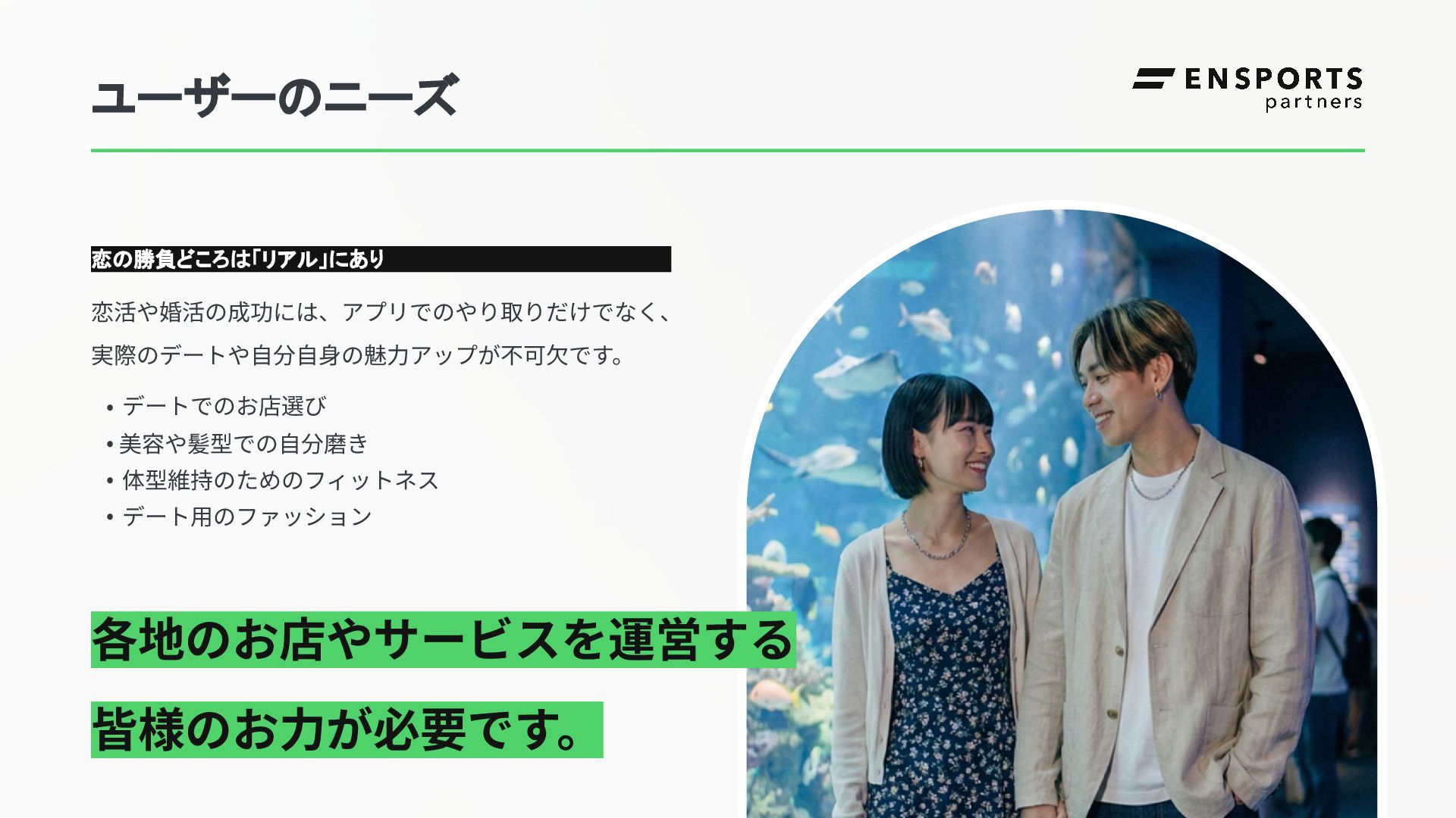 ユーザーのニーズ 恋の勝負どころは「リアル」にあり 恋活や婚活の成功には、アプリでのやり取りだけでなく、 実際のデートや⾃分⾃⾝の魅⼒アップが不可⽋です。 • デートでのお店選び • 美容や髪型での⾃分磨き • 体型維持のためのフィットネス