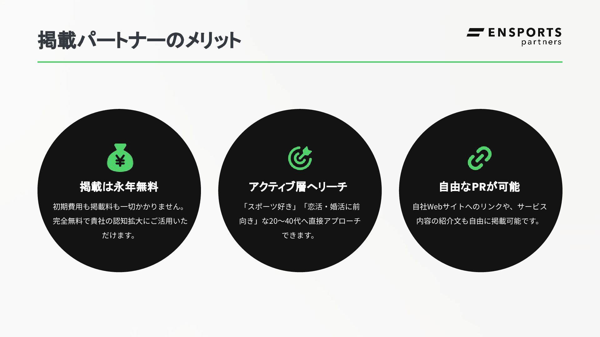 掲載パートナーのメリット 掲載は永年無料 初期費⽤も掲載料も⼀切かかりません。 完全無料で貴社の認知拡⼤にご活⽤いた だけます。 アクティブ層へリーチ 「スポーツ好き」「恋活‧婚活に前 向き」な20〜40代へ直接アプローチ できます。 自由なPRが可能