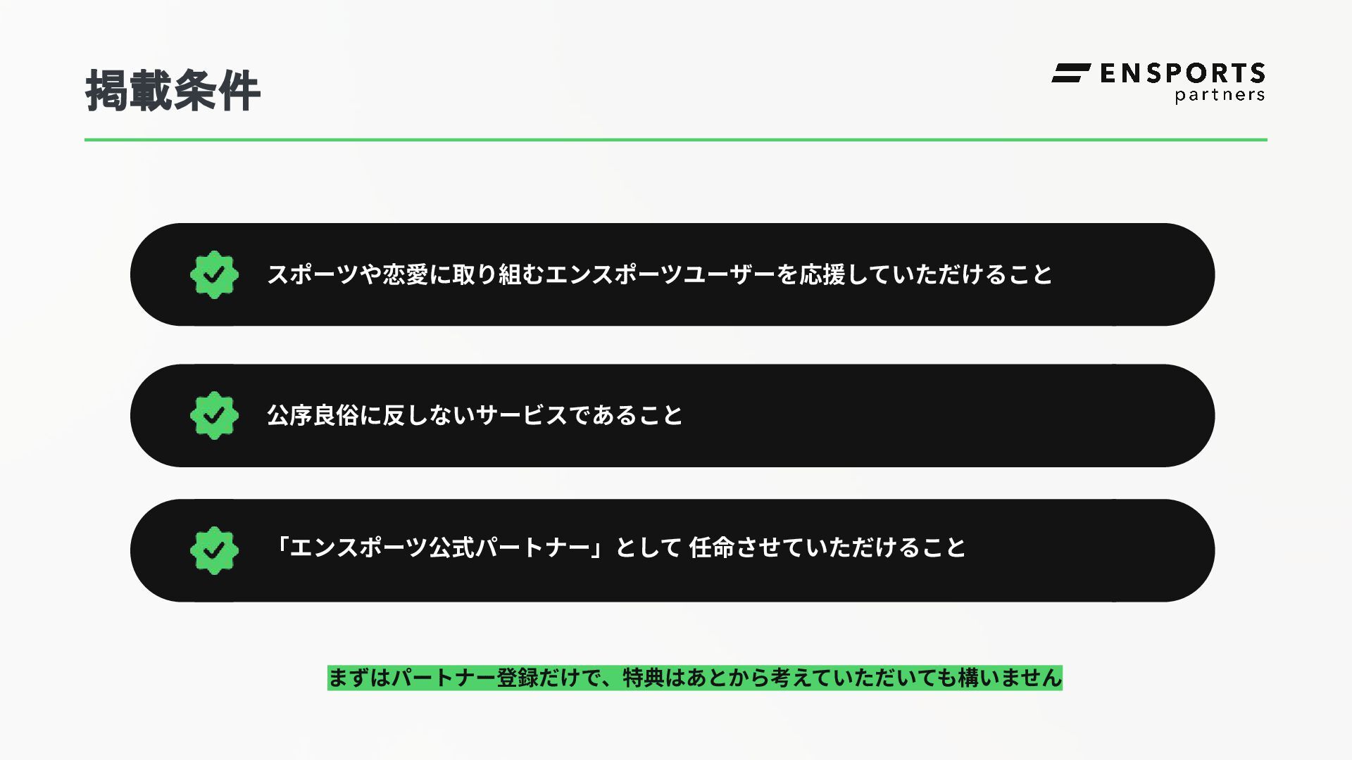 掲載条件 まずはパートナー登録だけで、特典はあとから考えていただいても構いません 公序良俗に反しないサービスであること ご⾃⾝でサービス内容やキャンペーンを登録‧編集していただけること スポーツや恋愛に取り組むエンスポーツユーザーを応援していただけること