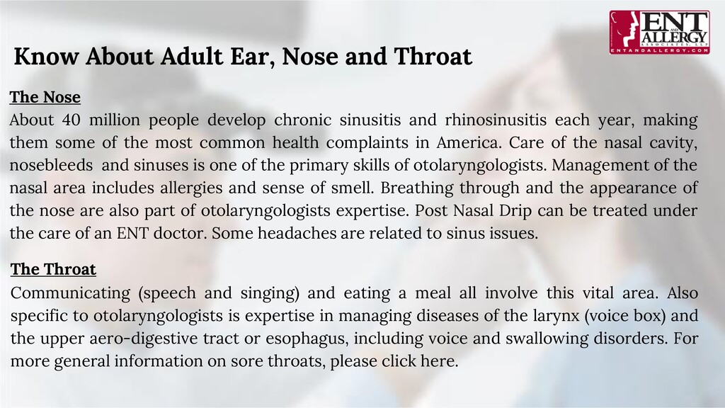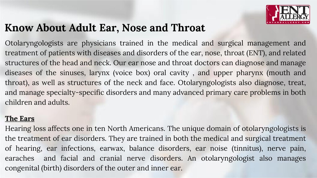 and treatment of patients with diseases and disorders of the ear, nose, throat (ENT), and related structures of the head and neck. Our ear nose and throat doctors can diagnose and manage diseases of the sinuses, larynx (voice box) oral cavity , and upper pharynx (mouth and throat), as well as structures of the neck and face. Otolaryngologists also diagnose, treat, and manage specialty-specific disorders and many advanced primary care problems in both children and adults. Know About Adult Ear, Nose and Throat The Ears Hearing loss affects one in ten North Americans. The unique domain of otolaryngologists is the treatment of ear disorders. They are trained in both the medical and surgical treatment of hearing, ear infections, earwax, balance disorders, ear noise (tinnitus), nerve pain, earaches and facial and cranial nerve disorders. An otolaryngologist also manages congenital (birth) disorders of the outer and inner ear.