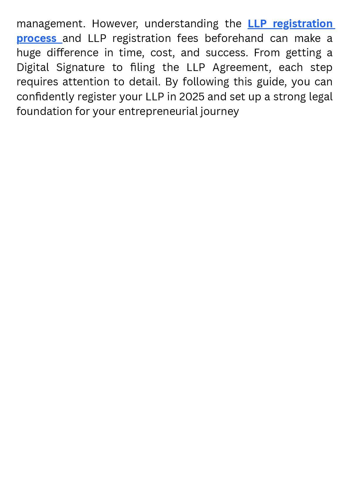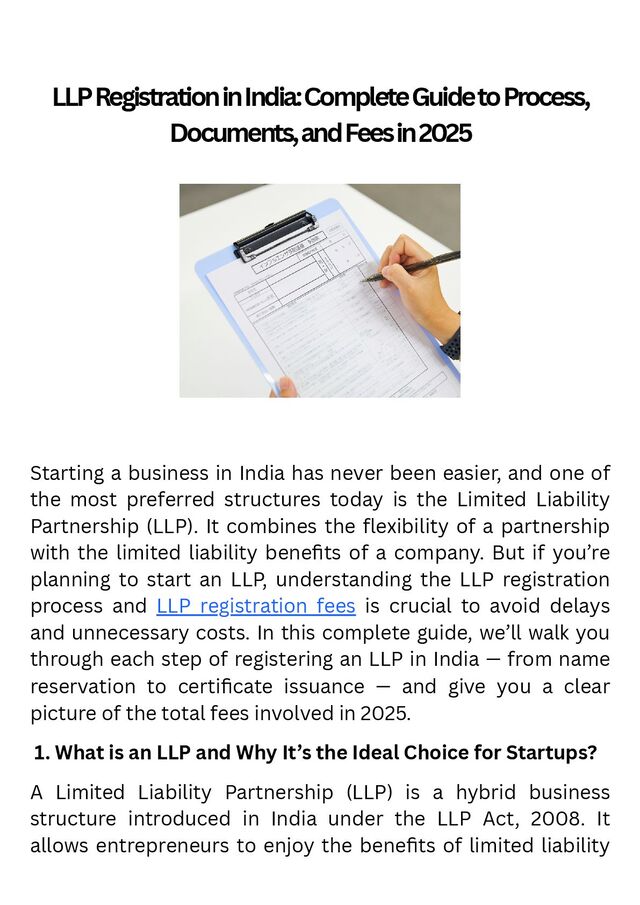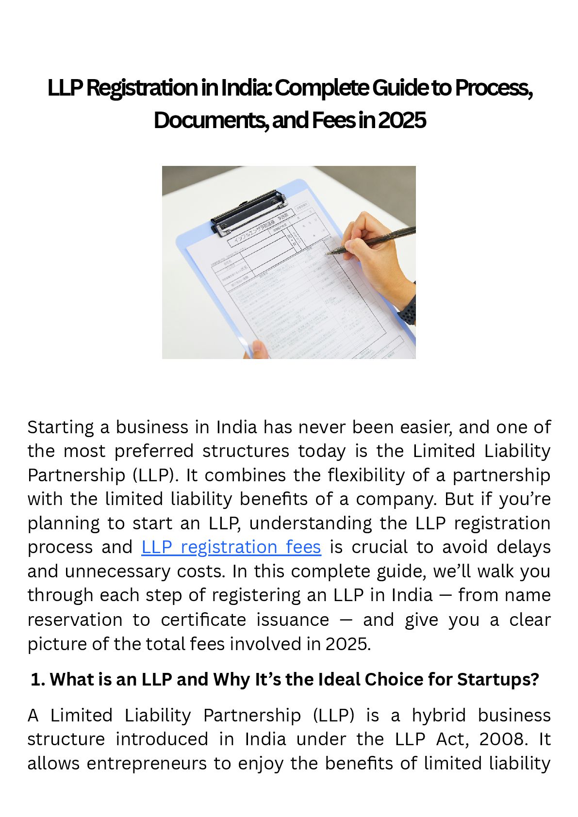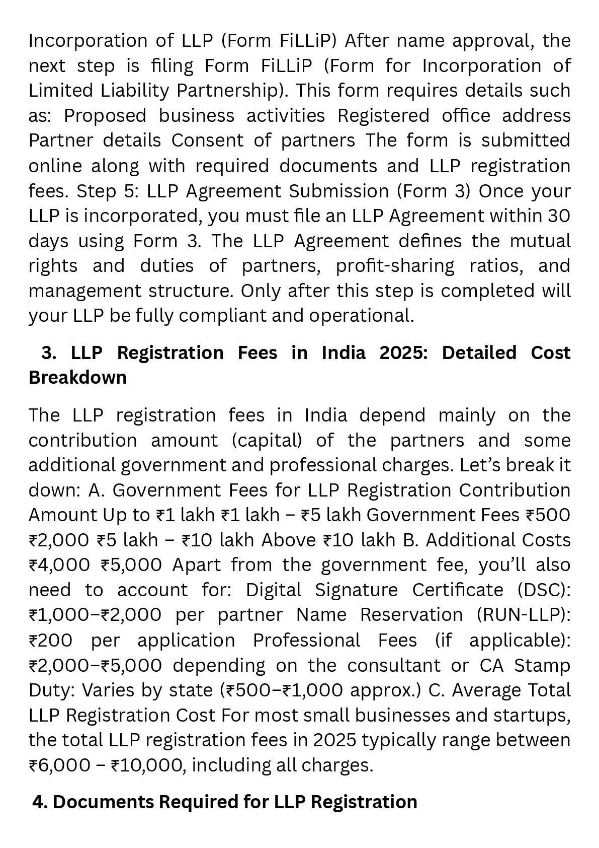 step is filing Form FiLLiP (Form for Incorporation of Limited Liability Partnership). This form requires details such as: Proposed business activities Registered office address Partner details Consent of partners The form is submitted online along with required documents and LLP registration fees. Step 5: LLP Agreement Submission (Form 3) Once your LLP is incorporated, you must file an LLP Agreement within 30 days using Form 3. The LLP Agreement defines the mutual rights and duties of partners, profit-sharing ratios, and management structure. Only after this step is completed will your LLP be fully compliant and operational. 3. LLP Registration Fees in India 2025: Detailed Cost Breakdown The LLP registration fees in India depend mainly on the contribution amount (capital) of the partners and some additional government and professional charges. Let’s break it down: A. Government Fees for LLP Registration Contribution Amount Up to ₹1 lakh ₹1 lakh – ₹5 lakh Government Fees ₹500 ₹2,000 ₹5 lakh – ₹10 lakh Above ₹10 lakh B. Additional Costs ₹4,000 ₹5,000 Apart from the government fee, you’ll also need to account for: Digital Signature Certificate (DSC): ₹1,000–₹2,000 per partner Name Reservation (RUN-LLP): ₹200 per application Professional Fees (if applicable): ₹2,000–₹5,000 depending on the consultant or CA Stamp Duty: Varies by state (₹500–₹1,000 approx.) C. Average Total LLP Registration Cost For most small businesses and startups, the total LLP registration fees in 2025 typically range between ₹6,000 – ₹10,000, including all charges. 4. Documents Required for LLP Registration