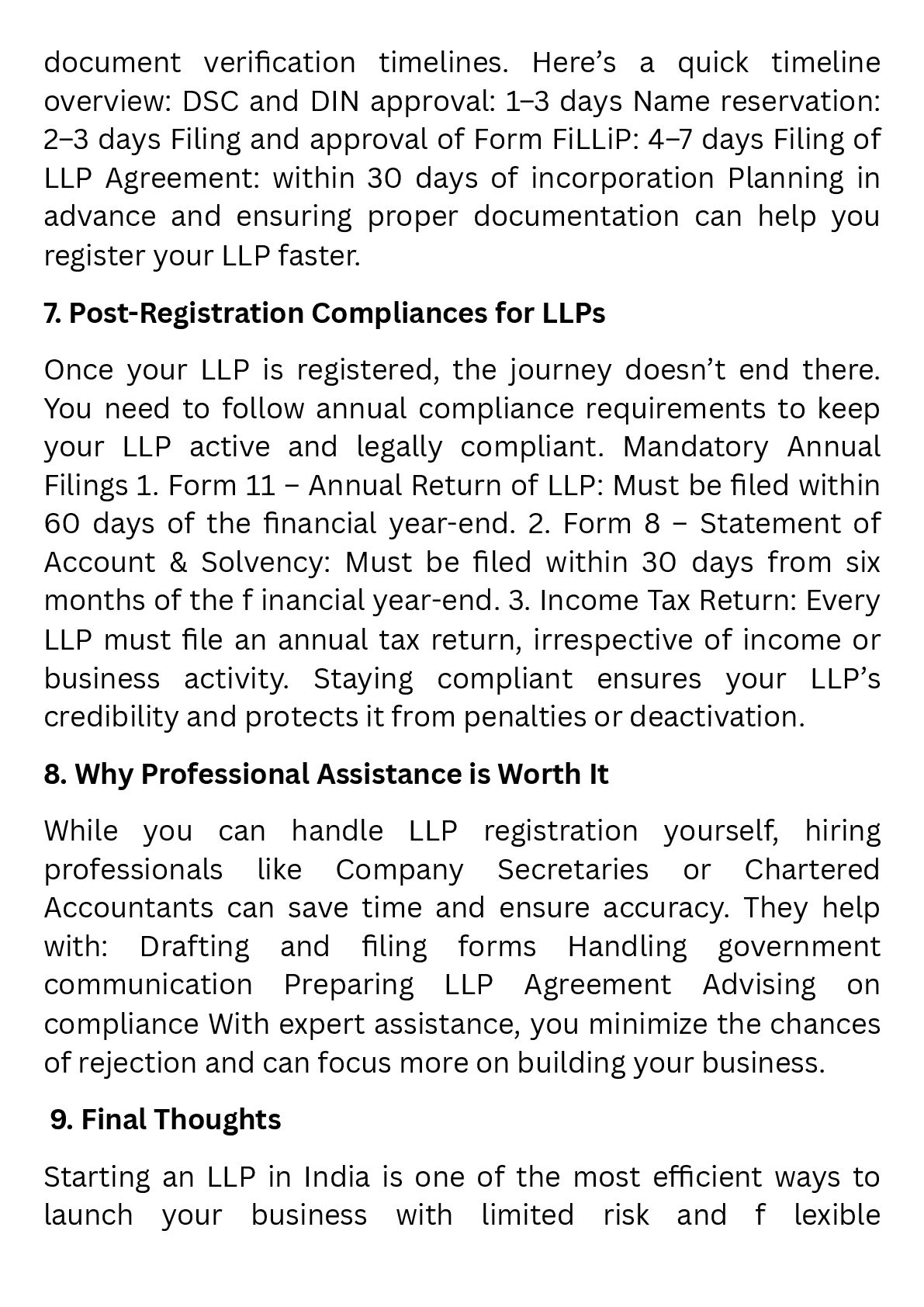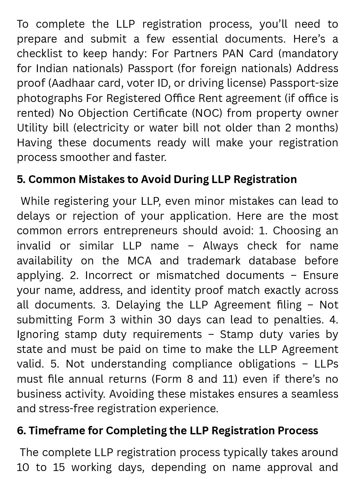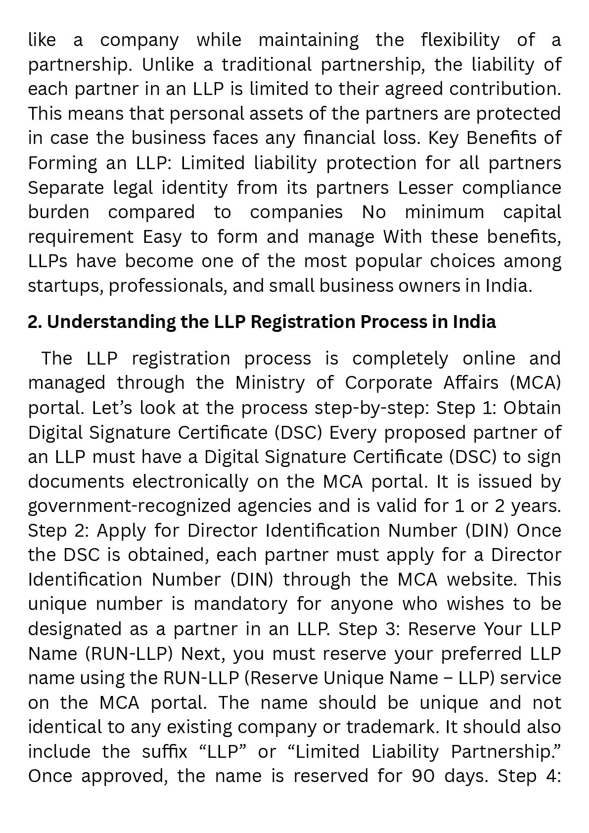 step is filing Form FiLLiP (Form for Incorporation of Limited Liability Partnership). This form requires details such as: Proposed business activities Registered office address Partner details Consent of partners The form is submitted online along with required documents and LLP registration fees. Step 5: LLP Agreement Submission (Form 3) Once your LLP is incorporated, you must file an LLP Agreement within 30 days using Form 3. The LLP Agreement defines the mutual rights and duties of partners, profit-sharing ratios, and management structure. Only after this step is completed will your LLP be fully compliant and operational. 3. LLP Registration Fees in India 2025: Detailed Cost Breakdown The LLP registration fees in India depend mainly on the contribution amount (capital) of the partners and some additional government and professional charges. Let’s break it down: A. Government Fees for LLP Registration Contribution Amount Up to ₹1 lakh ₹1 lakh – ₹5 lakh Government Fees ₹500 ₹2,000 ₹5 lakh – ₹10 lakh Above ₹10 lakh B. Additional Costs ₹4,000 ₹5,000 Apart from the government fee, you’ll also need to account for: Digital Signature Certificate (DSC): ₹1,000–₹2,000 per partner Name Reservation (RUN-LLP): ₹200 per application Professional Fees (if applicable): ₹2,000–₹5,000 depending on the consultant or CA Stamp Duty: Varies by state (₹500–₹1,000 approx.) C. Average Total LLP Registration Cost For most small businesses and startups, the total LLP registration fees in 2025 typically range between ₹6,000 – ₹10,000, including all charges. 4. Documents Required for LLP Registration