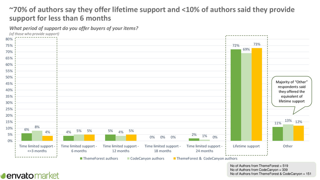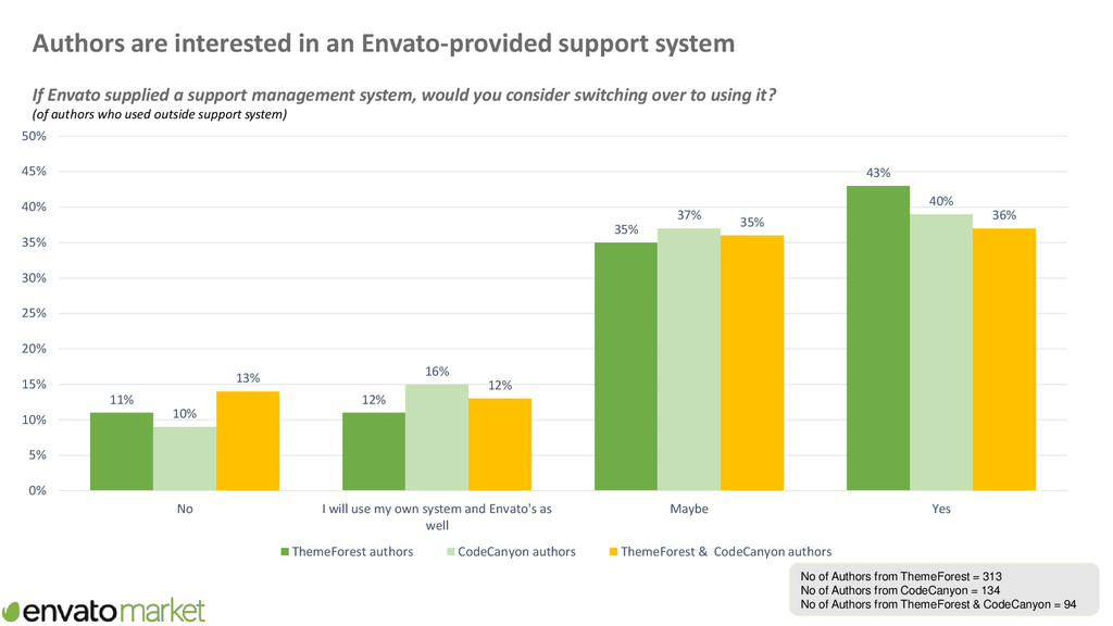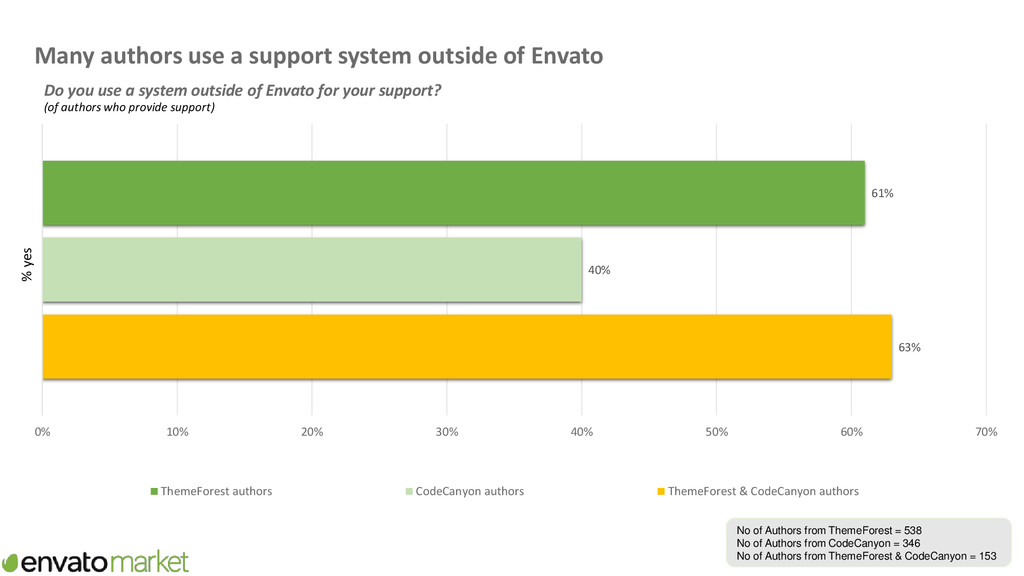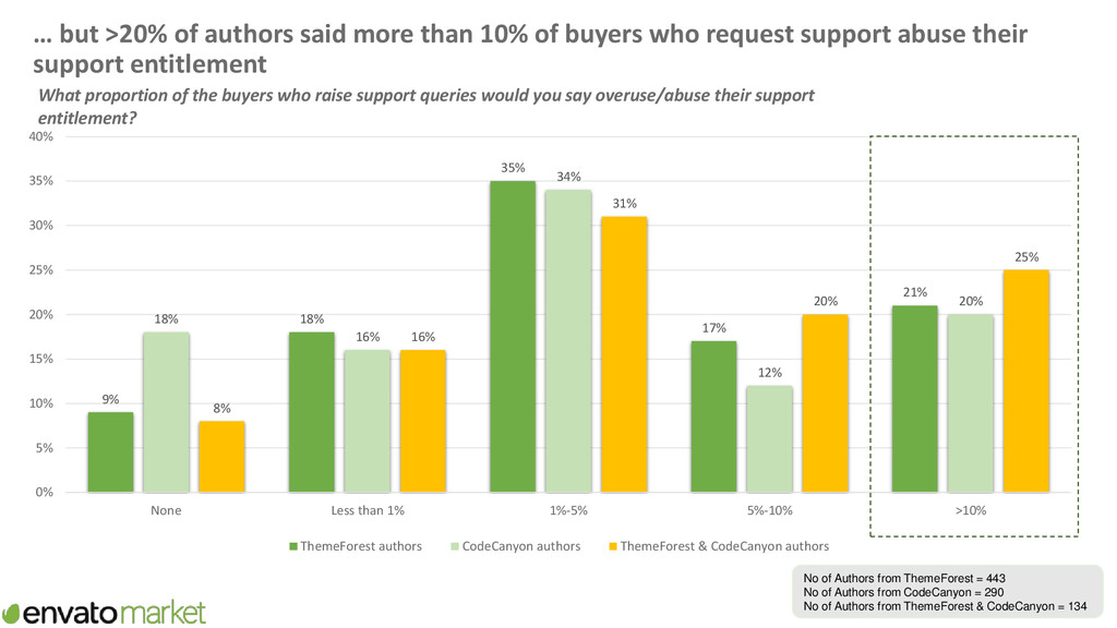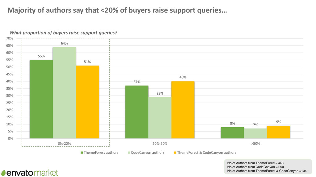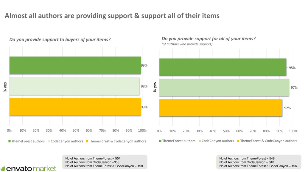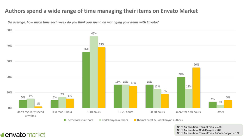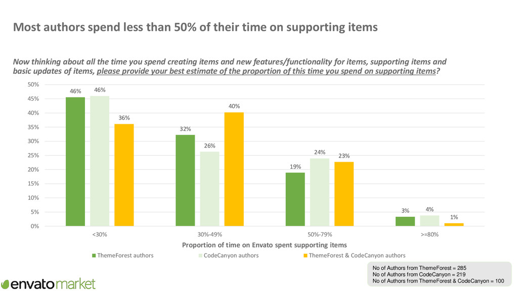 supporting items Now thinking about all the time you spend creating items and new features/functionality for items, supporting items and basic updates of items, please provide your best estimate of the proportion of this time you spend on supporting items? 46% 32% 19% 3% 46% 26% 24% 4% 36% 40% 23% 1% 0% 5% 10% 15% 20% 25% 30% 35% 40% 45% 50% <30% 30%-49% 50%-79% >=80% Proportion of time on Envato spent supporting items ThemeForest authors CodeCanyon authors ThemeForest & CodeCanyon authors No of Authors from ThemeForest = 285 No of Authors from CodeCanyon = 219 No of Authors from ThemeForest & CodeCanyon = 100
