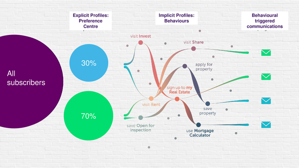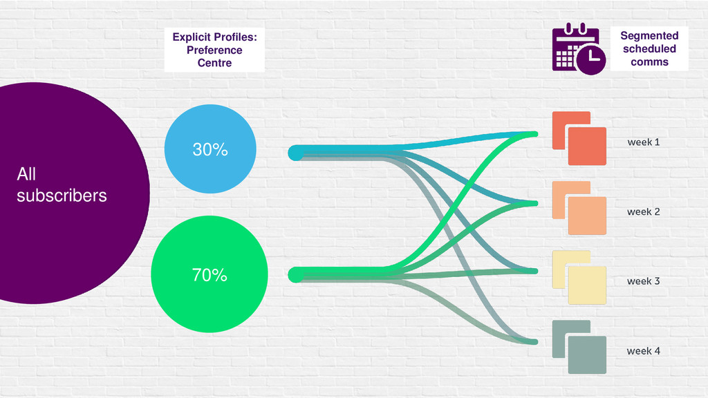 Segmented scheduled comms Explicit Profiles: Preference Centre All subscribers 30%