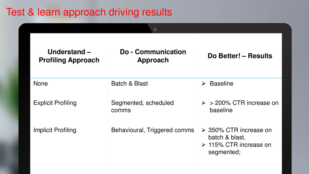 Do - Communication Approach Do Better! – Results None Batch & Blast Baseline Explicit Profiling Segmented, scheduled comms > 200% CTR increase on baseline Implicit Profiling Behavioural, Triggered comms 350% CTR increase on batch & blast. 115% CTR increase on segmented;