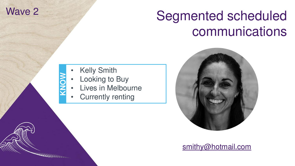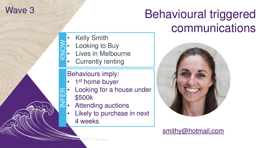 Looking to Buy • Lives in Melbourne • Currently renting KNOW INFER Behaviours imply: • 1st home buyer • Looking for a house under $500k • Attending auctions • Likely to purchase in next 4 weeks