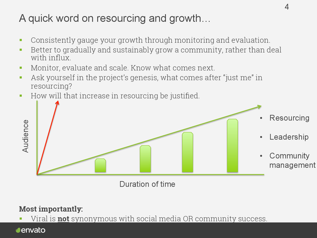 your growth through monitoring and evaluation. § Better to gradually and sustainably grow a community, rather than deal with influx. § Monitor, evaluate and scale. Know what comes next. § Ask yourself in the project’s genesis, what comes after “just me” in resourcing? § How will that increase in resourcing be justified. Most importantly: § Viral is not synonymous with social media OR community success. 4 Audience Duration of time • Resourcing • Leadership • Community management