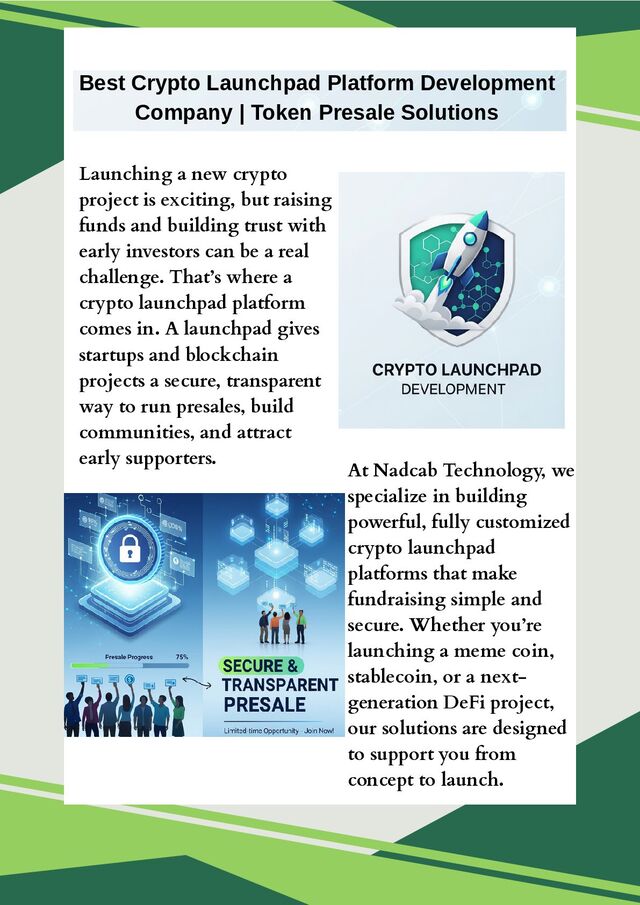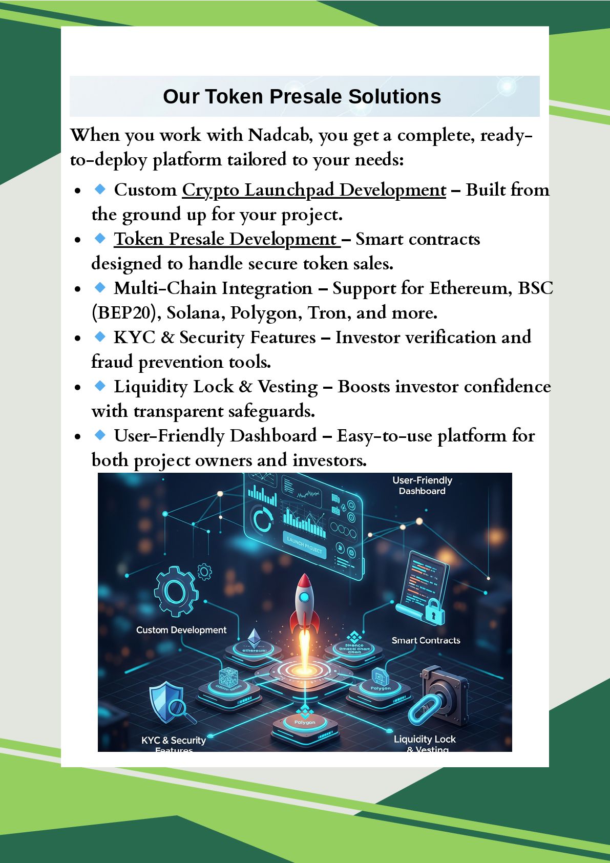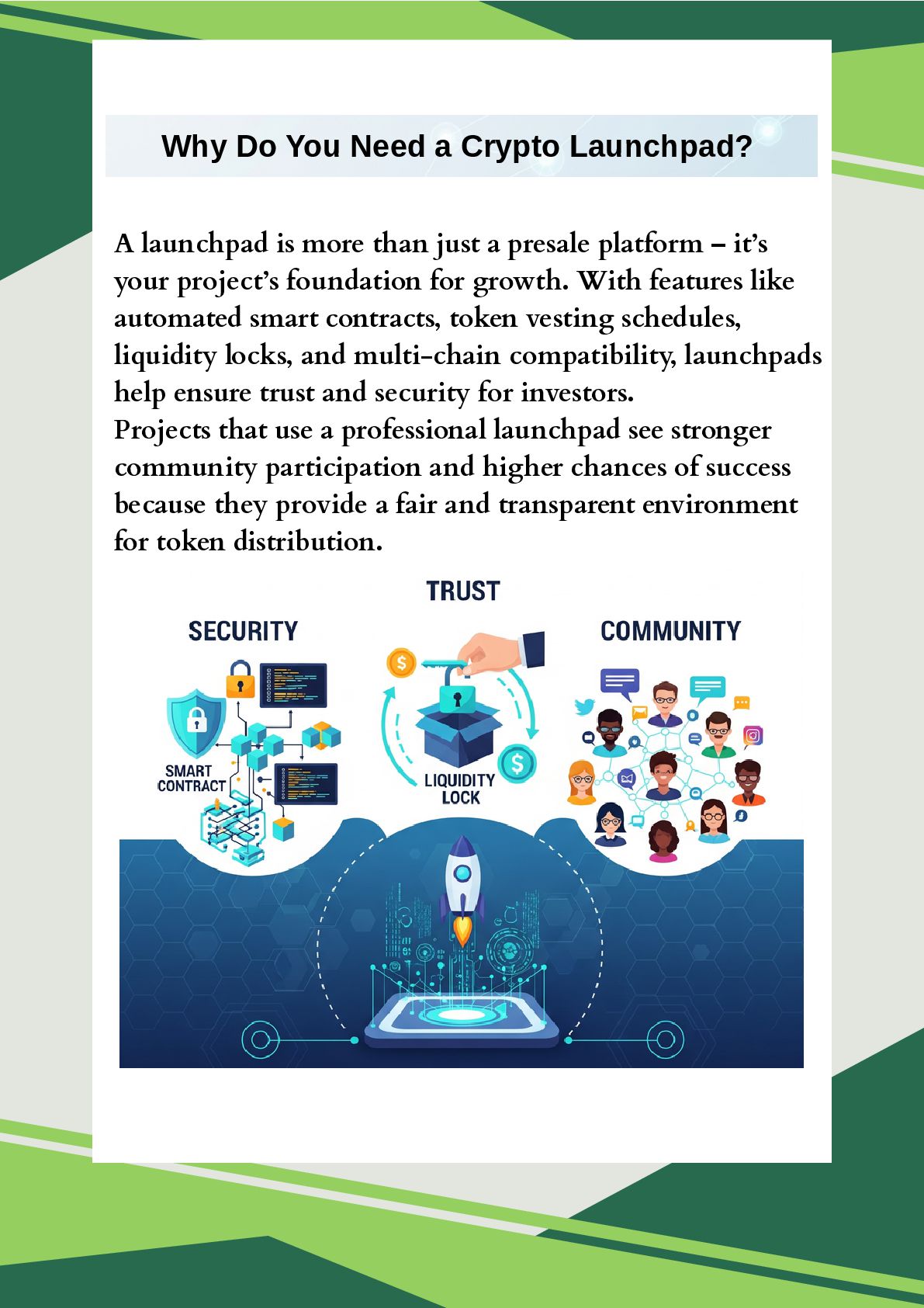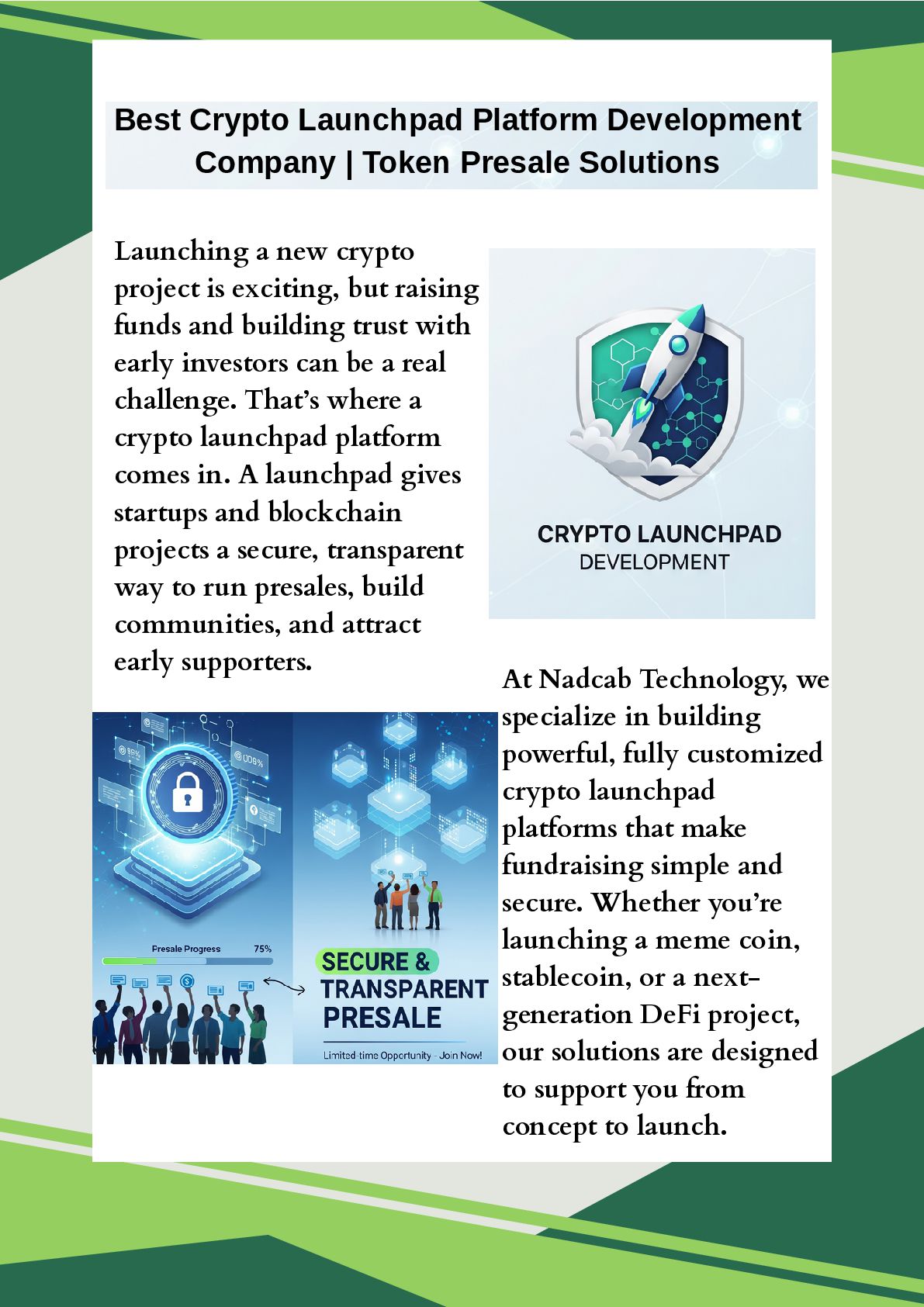 Discover the Best Crypto Launchpad Platform Development Company offering advanced token presale solutions. A crypto launchpad allows startups to raise funds securely while giving investors early access to tokens. With features like multi-chain support (Ethereum, BSC, Solana, Polygon), KYC/AML, liquidity locks, vesting schedules, and smart contract automation, our solutions ensure transparency and security. Whether you need BEP20, ERC20, TRC20, or SPL token launchpads, we provide fully customizable platforms to launch your project successfully.