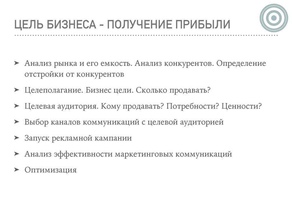 емкость. Анализ конкурентов. Определение отстройки от конкурентов ➤ Целеполагание. Бизнес цели. Сколько продавать? ➤ Целевая аудитория. Кому продавать? Потребности? Ценности? ➤ Выбор каналов коммуникаций с целевой аудиторией ➤ Запуск рекламной кампании ➤ Анализ эффективности маркетинговых коммуникаций ➤ Оптимизация