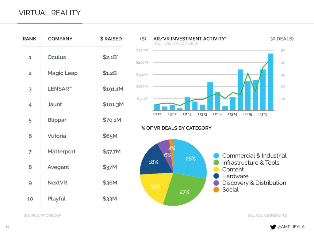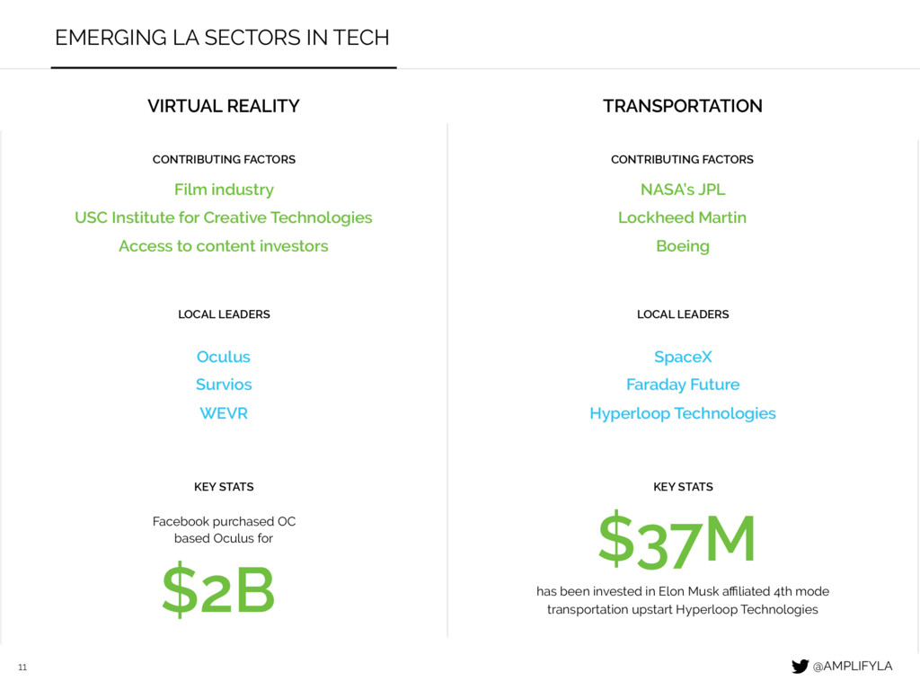 FACTORS LOCAL LEADERS KEY STATS Oculus Survios WEVR CONTRIBUTING FACTORS LOCAL LEADERS KEY STATS Faraday Future SpaceX Hyperloop Technologies Film industry USC Institute for Creative Technologies Access to content investors NASA’s JPL Lockheed Martin Boeing $2B Facebook purchased OC based Oculus for $37M has been invested in Elon Musk affiliated 4th mode transportation upstart Hyperloop Technologies @AMPLIFYLA