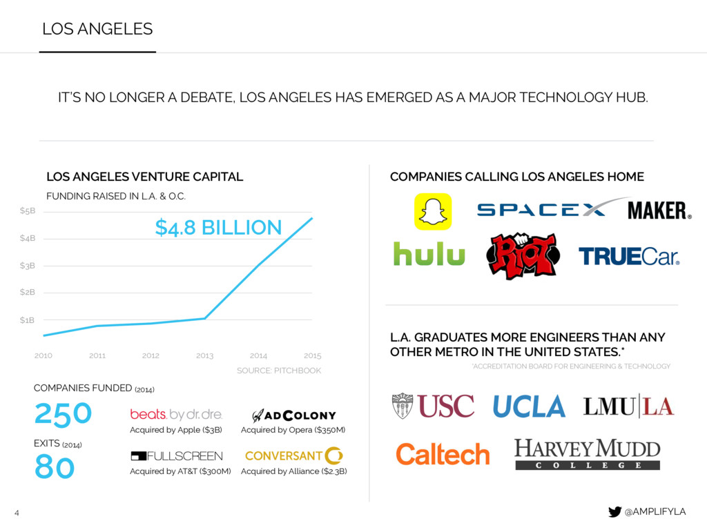 HAS EMERGED AS A MAJOR TECHNOLOGY HUB. LOS ANGELES VENTURE CAPITAL 2010 2011 2012 2013 2014 2015 FUNDING RAISED IN L.A. & O.C. $4.8 BILLION COMPANIES FUNDED (2014) 250 EXITS (2014) 80 COMPANIES CALLING LOS ANGELES HOME L.A. GRADUATES MORE ENGINEERS THAN ANY OTHER METRO IN THE UNITED STATES.* $4B $3B $2B $1B *ACCREDITATION BOARD FOR ENGINEERING & TECHNOLOGY Acquired by Opera ($350M) Acquired by Apple ($3B) Acquired by AT&T ($300M) Acquired by Alliance ($2.3B) $5B @AMPLIFYLA SOURCE: PITCHBOOK