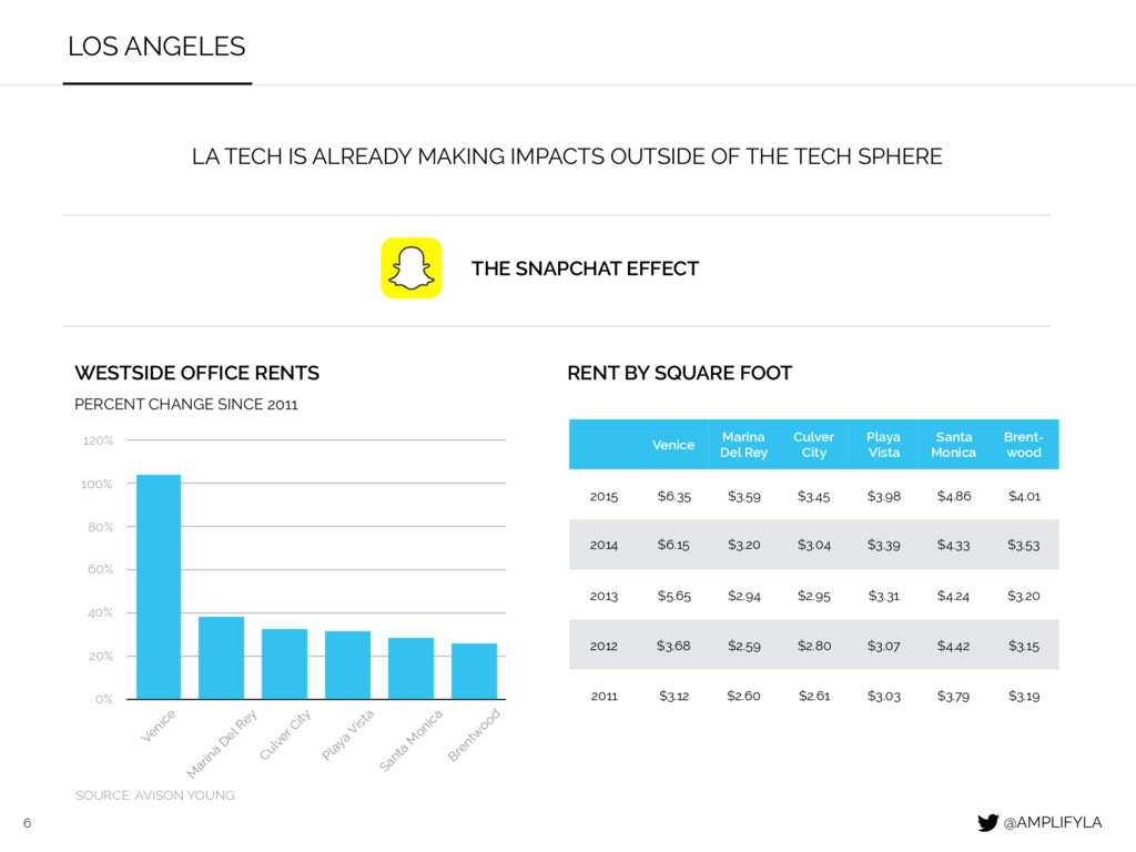OF THE TECH SPHERE WESTSIDE OFFICE RENTS PERCENT CHANGE SINCE 2011 RENT BY SQUARE FOOT THE SNAPCHAT EFFECT SOURCE: AVISON YOUNG 0% 20% 40% 60% 80% 100% 120% Venice M arina D el Rey Culver City Playa Vista Santa M onica Brentw ood Venice Marina Del Rey Culver City Playa Vista Santa Monica Brent- wood 2015 $6.35 $3.59 $3.45 $3.98 $4.86 $4.01 2014 $6.15 $3.20 $3.04 $3.39 $4.33 $3.53 2013 $5.65 $2.94 $2.95 $3.31 $4.24 $3.20 2012 $3.68 $2.59 $2.80 $3.07 $4.42 $3.15 2011 $3.12 $2.60 $2.61 $3.03 $3.79 $3.19 @AMPLIFYLA