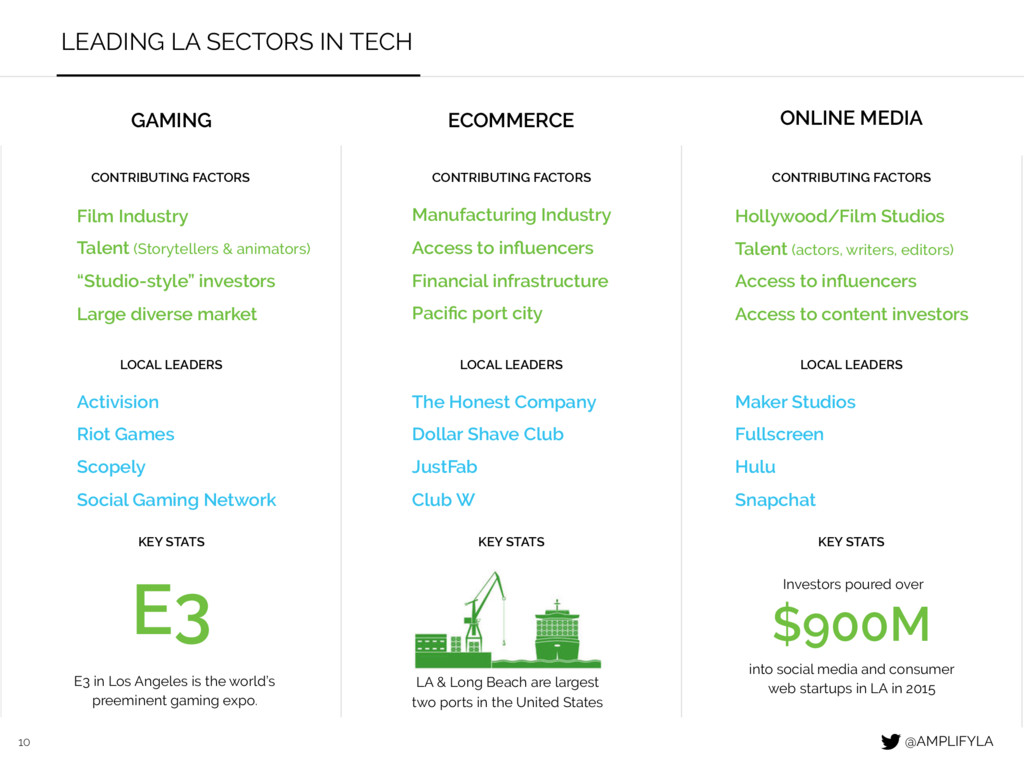 CONTRIBUTING FACTORS LOCAL LEADERS KEY STATS CONTRIBUTING FACTORS LOCAL LEADERS KEY STATS CONTRIBUTING FACTORS LOCAL LEADERS KEY STATS Activision Riot Games Scopely Social Gaming Network The Honest Company Dollar Shave Club JustFab Club W Maker Studios Fullscreen Hulu Snapchat Film Industry Talent (Storytellers & animators) “Studio-style” investors Large diverse market Manufacturing Industry Access to influencers Financial infrastructure Pacific port city Hollywood/Film Studios Talent (actors, writers, editors) Access to influencers Access to content investors $900M Investors poured over into social media and consumer web startups in LA in 2015 LA & Long Beach are largest two ports in the United States E3 E3 in Los Angeles is the world’s preeminent gaming expo. @AMPLIFYLA
