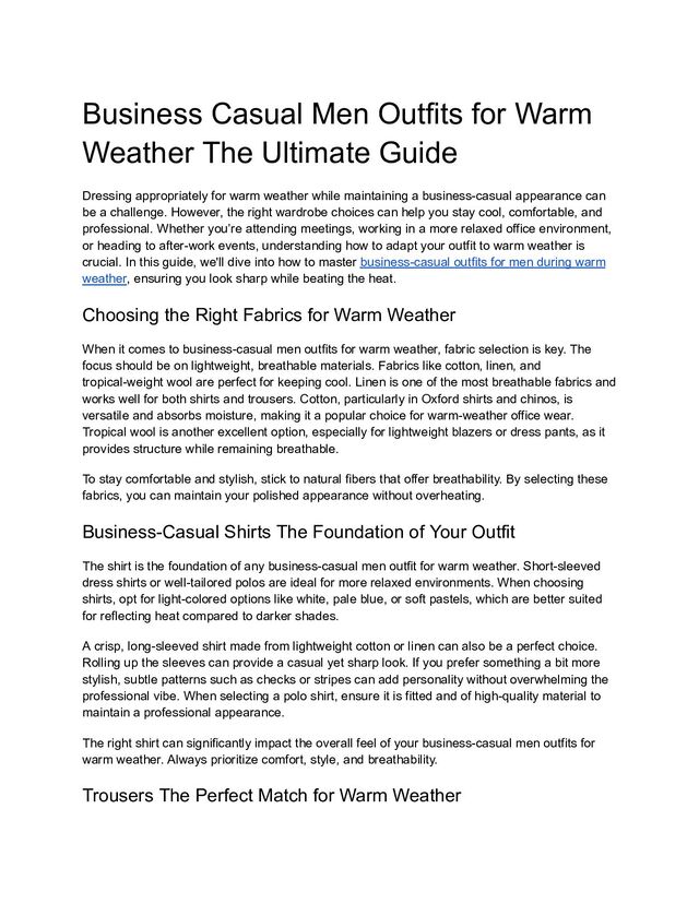 of trousers plays a crucial role. Chinos are an excellent option as they are light, comfortable, and versatile enough to work with various types of shirts. Slim or straight-leg chinos in neutral colors like beige, gray, or navy offer a clean, professional look that works for many settings. Lightweight dress pants made from tropical wool or cotton are another great option for more formal occasions. These trousers give a more polished appearance while keeping you cool. However, avoid heavy fabrics like thick wool or denim, as they can cause discomfort in high temperatures. If you work in a very casual office, shorts may be acceptable, but always opt for well-tailored shorts that reach just above the knee for a refined look. By choosing lightweight, breathable trousers, you can ensure your business-casual men outfits for warm weather are both stylish and comfortable. Blazers and Jackets The Summer Layer Blazers are a staple in any business-casual wardrobe, even in warm weather. To keep cool while maintaining a professional appearance, opt for unlined or partially lined blazers made from lightweight fabrics like linen, cotton, or seersucker. These materials provide structure without overheating you, making them perfect for layering over a light shirt. Light colors such as light gray, beige, or pastel blue work exceptionally well for summer, offering a fresh and seasonally appropriate look. You can pair these blazers with chinos or lightweight dress pants to create a complete and cohesive business-casual ensemble. Even if the day is particularly hot, having a summer blazer on hand is a smart move, ensuring your business-casual men outfits for warm weather remain polished for meetings or important events. Footwear Keep It Smart and Comfortable Footwear is an essential aspect of business-casual men outfits for warm weather. Opt for shoes that are breathable yet polished. Loafers, in leather or suede, are excellent choices as they offer comfort and professionalism. Brogues and lightweight dress shoes are also great options, providing a more formal touch without feeling overly heavy in the heat. No-show socks are a good option when wearing loafers to maintain comfort without sacrificing style. Avoid wearing flip-flops, sandals, or sneakers in professional environments, as these are too casual for a business-casual dress code. Your shoes should always complement the rest of your outfit and maintain the balance between comfort and sophistication. By choosing the right footwear, you complete the look of your business-casual men outfits for warm weather, ensuring a polished appearance from head to toe.