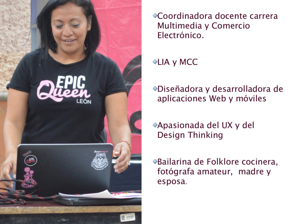 Diseñadora y desarrolladora de aplicaciones Web y móviles Apasionada del UX y del Design Thinking Bailarina de Folklore cocinera, fotógrafa amateur, madre y esposa.