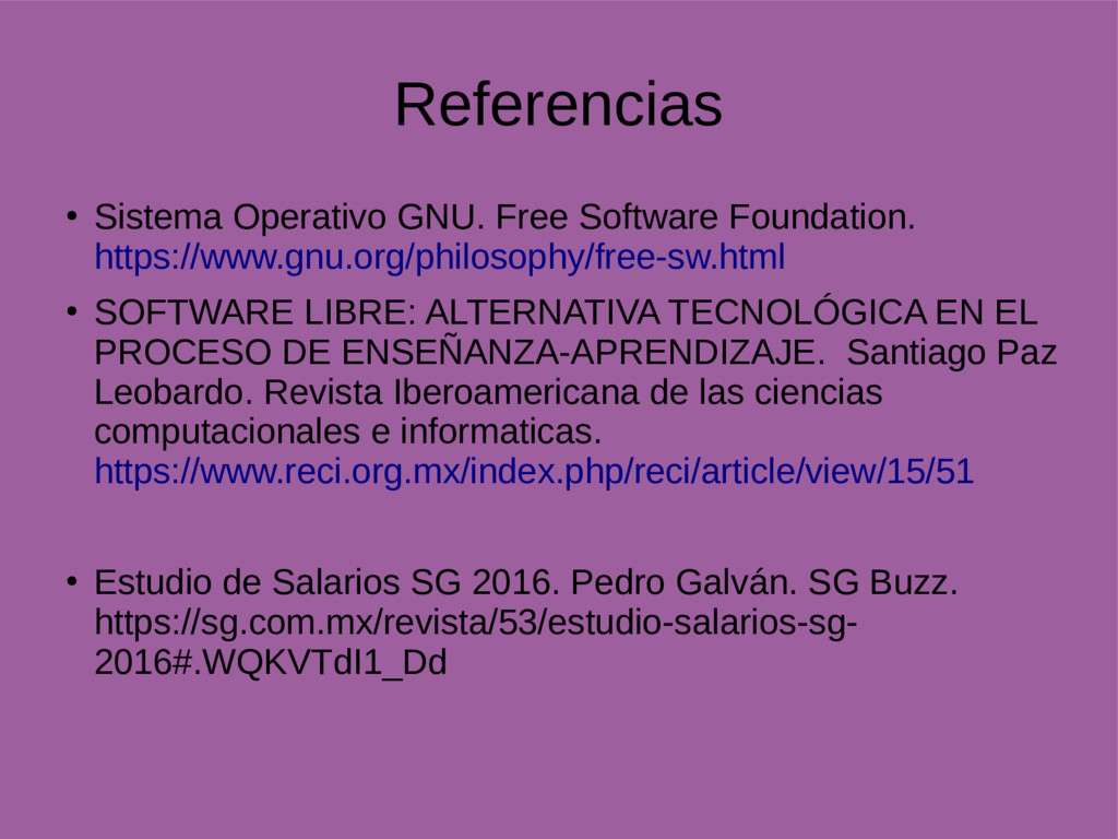 SOFTWARE LIBRE: ALTERNATIVA TECNOLÓGICA EN EL PROCESO DE ENSEÑANZA-APRENDIZAJE. Santiago Paz Leobardo. Revista Iberoamericana de las ciencias computacionales e informaticas. https://www.reci.org.mx/index.php/reci/article/view/15/51 • Estudio de Salarios SG 2016. Pedro Galván. SG Buzz. https://sg.com.mx/revista/53/estudio-salarios-sg- 2016#.WQKVTdI1_Dd