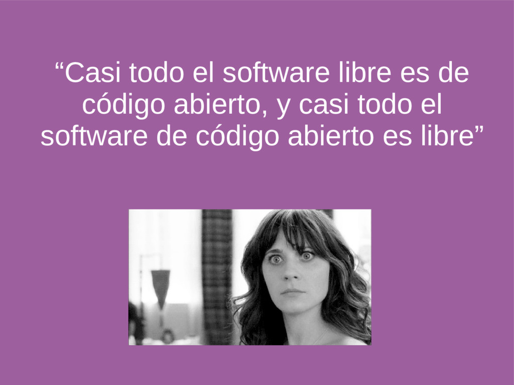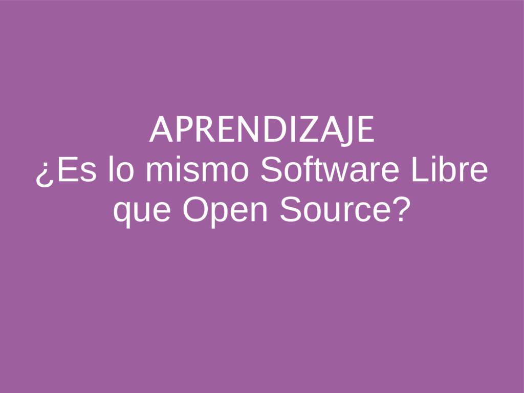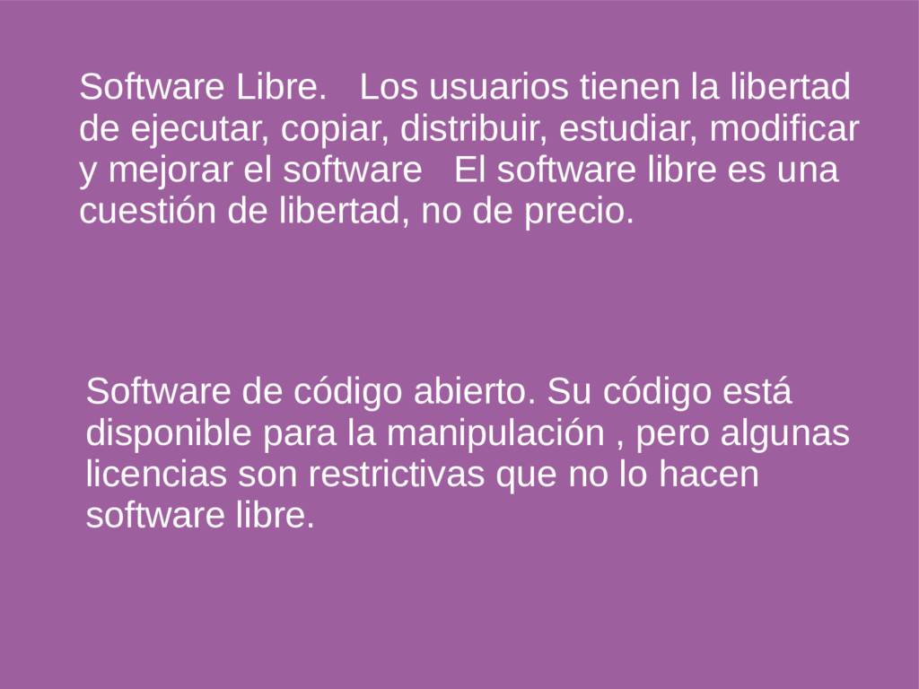 distribuir, estudiar, modificar y mejorar el software El software libre es una cuestión de libertad, no de precio. Software de código abierto. Su código está disponible para la manipulación , pero algunas licencias son restrictivas que no lo hacen software libre.