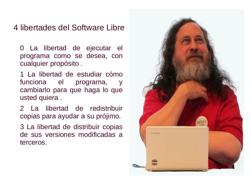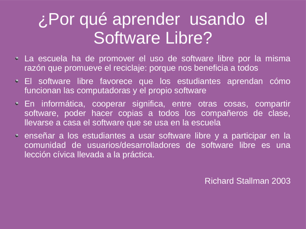 de promover el uso de software libre por la misma razón que promueve el reciclaje: porque nos beneficia a todos El software libre favorece que los estudiantes aprendan cómo funcionan las computadoras y el propio software En informática, cooperar significa, entre otras cosas, compartir software, poder hacer copias a todos los compañeros de clase, llevarse a casa el software que se usa en la escuela enseñar a los estudiantes a usar software libre y a participar en la comunidad de usuarios/desarrolladores de software libre es una lección cívica llevada a la práctica. Richard Stallman 2003