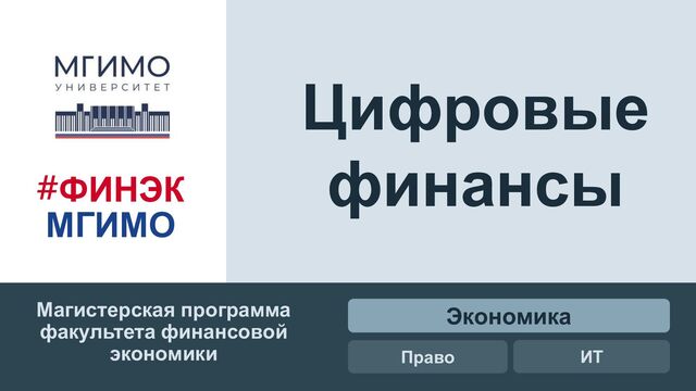 финансы, цифровая трансформация, анализ данных и коммуникации + НИР/практики Цифровое право ИТ-Технологии Магистерская программа #ФИНЭК МГИМО Направления подготовки «Юриспруденция» «Бизнес-информатика» Направление подготовки «Экономика»
