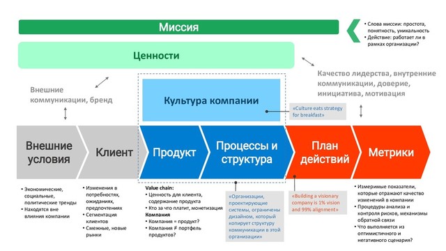 Ценности Культура компании • Экономические, социальные, политические тренды • Находятся вне влияния компании • Изменения в потребностях, ожиданиях, предпочтениях • Сегментация клиентов • Смежные, новые рынки Value chain: • Ценность для клиента, содержание продукта • Кто за что платит, монетизация Компания • Компания = продукт? • Компания ≠ портфель продуктов? • Измеримые показатели, которые отражают качество изменений в компании • Процедуры анализа и контроля рисков, механизмы обратной связи • Что выполняется из оптимистичного и негативного сценария? Внешние коммуникации, бренд Качество лидерства, внутренние коммуникации, доверие, инициатива, мотивация «Building a visionary company is 1% vision and 99% alignment» «Culture eats strategy for breakfast» • Слова миссии: простота, понятность, уникальность • Действие: работает ли в рамках организации? Миссия «Организации, проектирующие системы, ограничены дизайном, который копирует структуру коммуникации в этой организации»