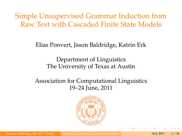 State Models Elias Ponvert, Jason Baldridge, Katrin Erk Department of Linguistics The University of Texas at Austin Association for Computational Linguistics 19–24 June, 2011 Ponvert, Baldridge, Erk (UT Austin) Simple Unsupervised Grammar Induction ACL 2011 1 / 34