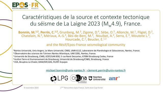 La Laigne 2023 (Mw 4.9), France. Bonnin, M.1,2, Perrin, C.1,2, Grunberg, M.3, Zigone, D.4, Sèbe, O.5, Alloncle, M.1, Fligiel, D.2, Chatelain, N.3, Mériaux, A.-S.4, Bès-de-Berc, M.3, Nouibat, A.4, Serra, E.4, Moutote L.4, Hourcade, C.1, Beucler, E.1,2 and the Résif/Epos-France seismological community 1ères Rencontres Epos-France, Saint-Jean-Cap-Ferrat 9 novembre 2023
