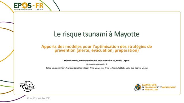 des stratégies de prévention (alerte, évacuation, préparation) Frédéric Leone, Monique Gherardi, Matthieu Péroche, Emilie Lagahé Université Montpellier 3 Fahad Idaroussi, Pierre Aumond, Jonathan Siliezar, Anne Mangeney, Anne Le Friant, Pablo Poulain, Said Hachim Mogne 07 au 10 novembre 2023