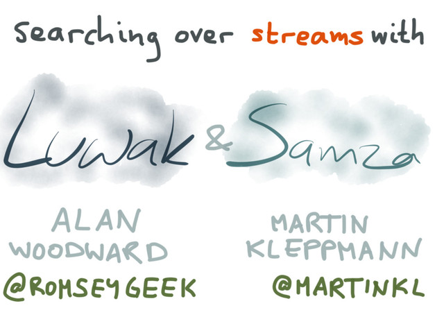 Talk co-presented with Alan Woodward at FOSDEM, Brussels, Belgium, on 31 January 2015. http://martin.kleppmann.com/2015/01/31/searching-over-streams-at-fosdem.html