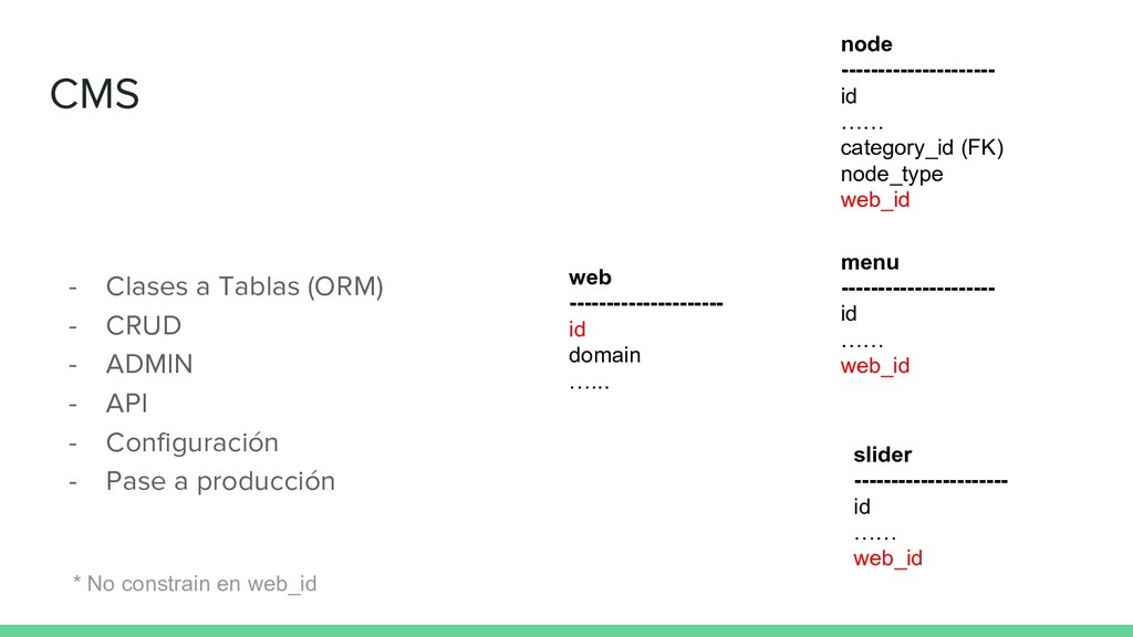 - API - Configuración - Pase a producción web --------------------- id domain …... menu --------------------- id …… web_id node --------------------- id …… category_id (FK) node_type web_id slider --------------------- id …… web_id * No constrain en web_id