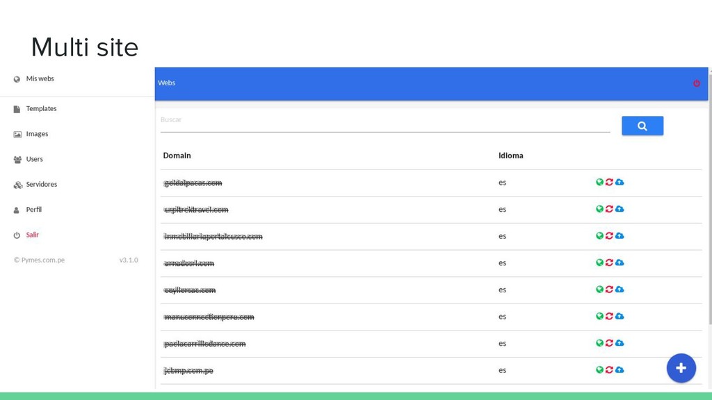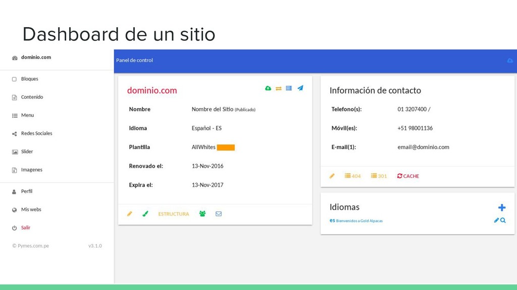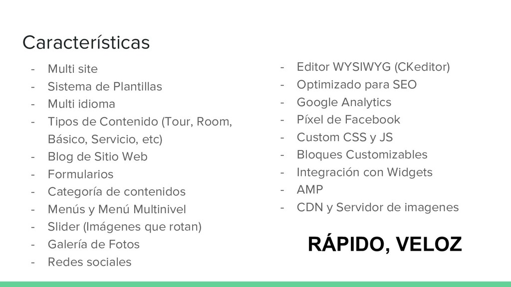 idioma - Tipos de Contenido (Tour, Room, Básico, Servicio, etc) - Blog de Sitio Web - Formularios - Categoría de contenidos - Menús y Menú Multinivel - Slider (Imágenes que rotan) - Galería de Fotos - Redes sociales - Editor WYSIWYG (CKeditor) - Optimizado para SEO - Google Analytics - Píxel de Facebook - Custom CSS y JS - Bloques Customizables - Integración con Widgets - AMP - CDN y Servidor de imagenes RÁPIDO, VELOZ