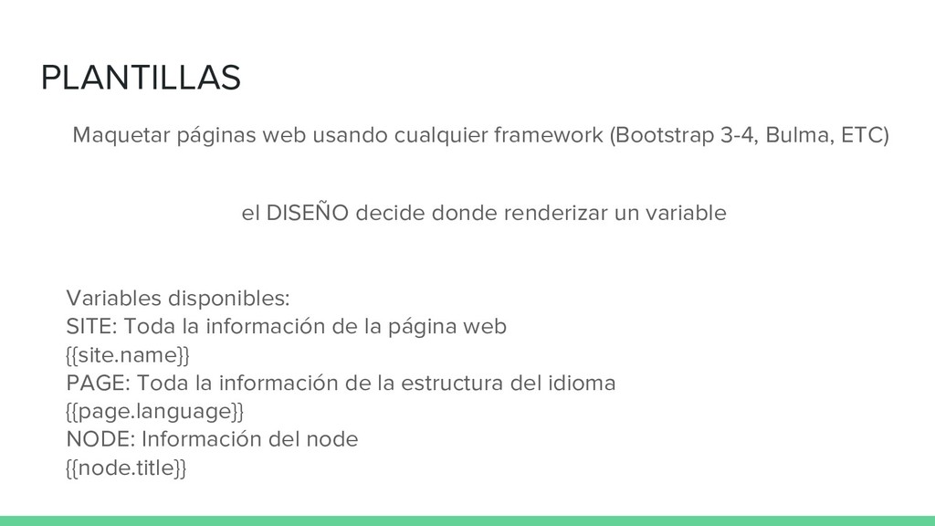 web {{site.name}} PAGE: Toda la información de la estructura del idioma {{page.language}} NODE: Información del node {{node.title}} Maquetar páginas web usando cualquier framework (Bootstrap 3-4, Bulma, ETC) el DISEÑO decide donde renderizar un variable