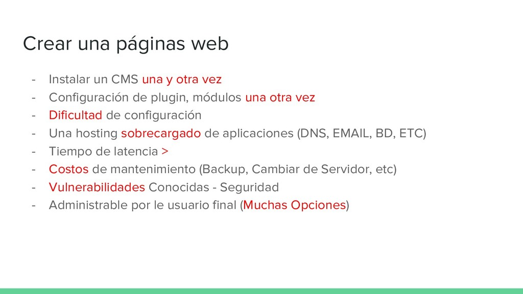 otra vez - Configuración de plugin, módulos una otra vez - Dificultad de configuración - Una hosting sobrecargado de aplicaciones (DNS, EMAIL, BD, ETC) - Tiempo de latencia > - Costos de mantenimiento (Backup, Cambiar de Servidor, etc) - Vulnerabilidades Conocidas - Seguridad - Administrable por le usuario final (Muchas Opciones)