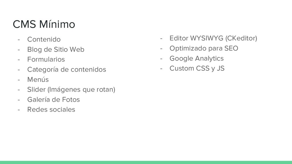 Formularios - Categoría de contenidos - Menús - Slider (Imágenes que rotan) - Galería de Fotos - Redes sociales - Editor WYSIWYG (CKeditor) - Optimizado para SEO - Google Analytics - Custom CSS y JS