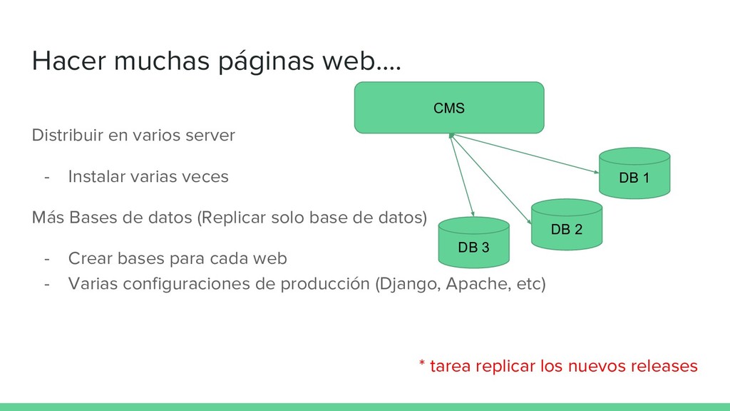 varias veces Más Bases de datos (Replicar solo base de datos) - Crear bases para cada web - Varias configuraciones de producción (Django, Apache, etc) * tarea replicar los nuevos releases CMS DB 1 DB 2 DB 3